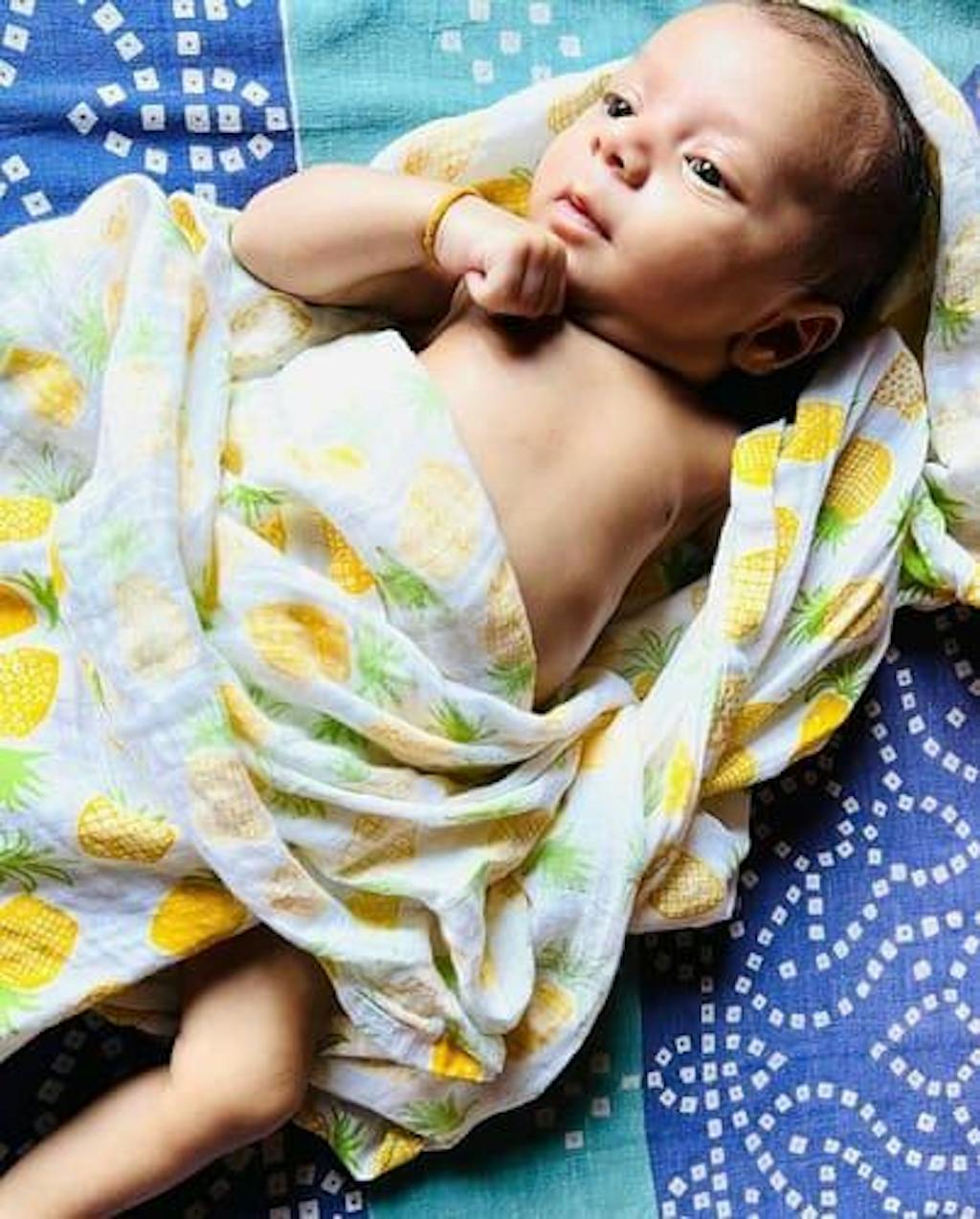 Our Fruity Pineapple Print Muslin Swaddle Wrap is 100% mulmul / muslin and 45 * 45 inches in size suitable for babies upto 6 months. The double layered muslin fabric will keep your babies warm, calm and comfortable. These muslin swaddles can also be used as muslin towels and baby sheets. Made from one of the softest fabrics for the most delicate baby skin.