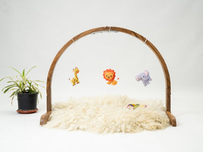 If space is a constraint, don’t worry! This beautiful wooden Arch Baby Gym will just fit in your small and cozy home. Baby gyms helps baby to attain the early milestones of life. Baby learns to grasp and hold the attached hanging toys, roll on the sides, explore the textures, and thus attain confidence about the surrounding in which they live. They are a great help to develop the gross motor skills in baby. Baby also learns cause and effect. This baby gym is easy to assemble. This baby gym comes with 4 beautiful and colorful cloud, star, sun and moon shaped hanging toys as shown in the image. These can be easily removed and used during tummy time of the baby. Also they can easily attaché to the stroller, pram, and crib. One can add his/her favorite toys to this baby gym. The beautiful Arch design adds to the beauty of the house. It’s a great gift for a newborn and a babyshower gift.