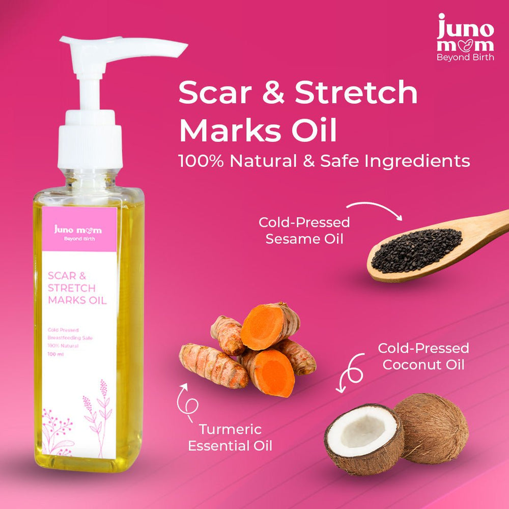 - Scar & Stretch Marks Oil: This natural scar and stretch mark oil, enriched with turmeric, almond and coconut oils, is crafted to effectively fade postpartum scars, including C-section marks, stretch marks, and other blemishes. Regular use ensures visible improvement over time.