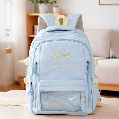 - Star Print Backpack with Detachable Keychain & Pins: This charming school backpack features a soft pastel yellow base with colourful star prints. It includes a front elastic bungee cord pocket for quick-access storage and added style. It also comes with a detachable plush star character keychain and two cute decorative star pins, allowing kids to personalise their backpack in a fun and playful way.