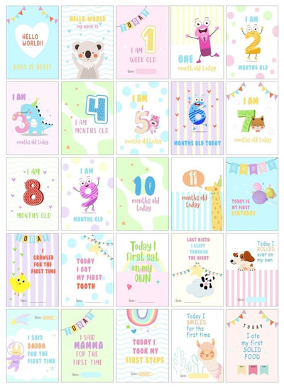Your little one's growth is a precious memory. It's amazing how fast babies grow each day and month to month. Keep track of your precious memories each month with your little one. These super cool cards with fun designs will help you track your baby's milestone and those very first moments close forever.