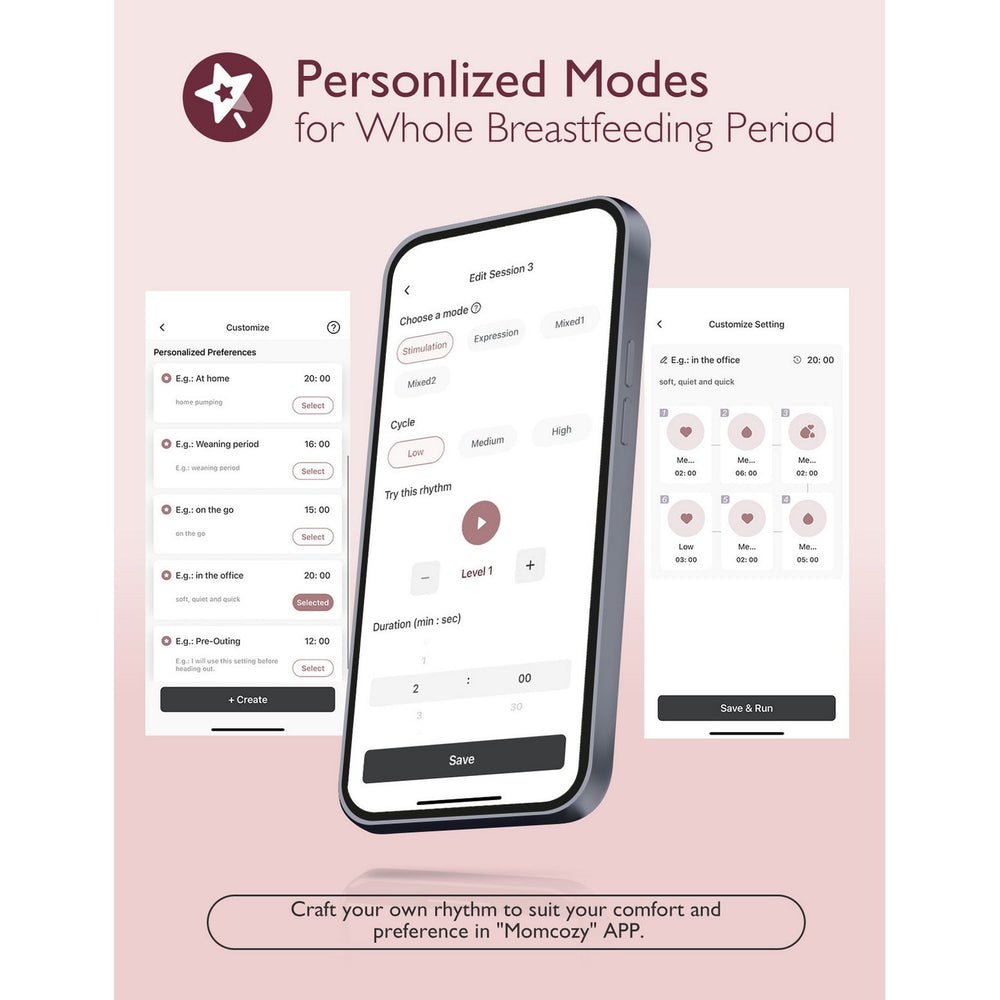 Smart Pumping: Control the Mobile Flow via the "Momcozy" app to start/pause/countdown pumping and switch to different pumping settings. No need to reach into your bra! Record every breastmilk yield to track your pumping history. Know yourself better, Pump on your terms.