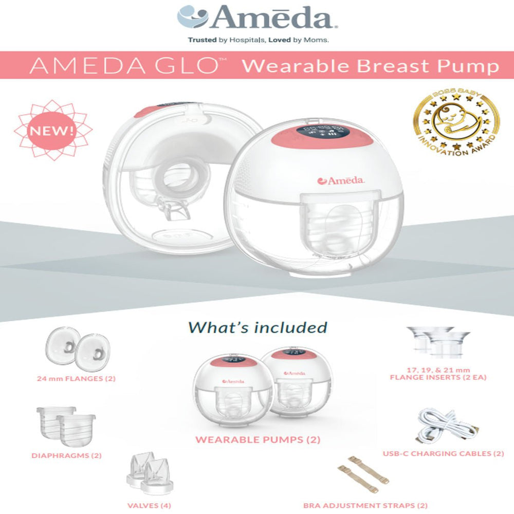 The Ameda Glo is a dual wearable breast pump designed for modern moms. It offers hospital-grade performance with milk optimization technology, featuring 4 pumping modes and 15 suction levels. The pump stores your preferred settings with pumping level memory and fits discreetly inside your bra for hands-free pumping.