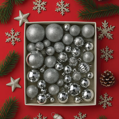 - Red Shiny Mix Themed Xmas Balls: This box is filled with 45 beautifully crafted ornaments inspired by classic Christmas elegance. Each piece is a stunning blend of glossy red baubles, glitter coated balls, ribbed texture designs, reflective mirror finish ornaments and more. Each ornament showcases fine detailing and a bold red sparkle that enhances the festive charm of your tree.