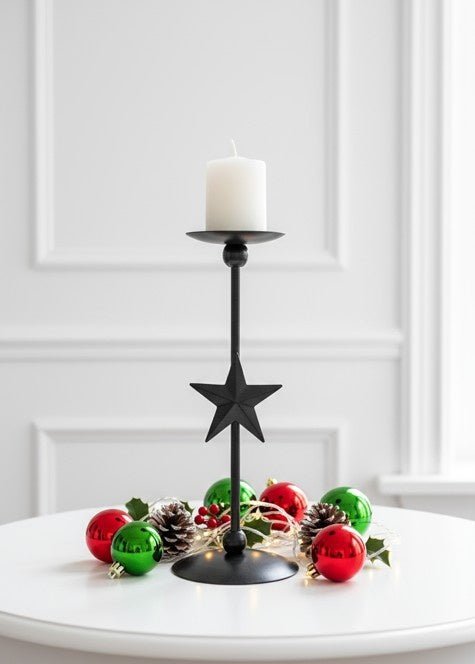 Elevate your holiday lighting with MADALINA - the tall midnight Star Taper Candle Holder by SWEN. This sophisticated piece blends traditional function with a striking, modern accent, making it a perfect statement piece for your festive decor. MADALINA features a tall, slender central stem that lifts the candle high, providing dramatic height and visibility for your light display. A dimensional, five-pointed star detail is securely centered on the stem, adding a festive, yet minimalist, holiday or celestial touch. Constructed from durable metal with a refined matte black finish, MADALINA offers a contemporary, high-contrast look against white candles and colorful holiday settings. It is also equipped with a wide, flat base for excellent stability and a classic round drip tray top to hold your candle securely and catch wax. MADALINA is ideal for holding standard taper candles and looks fantastic alone or paired with other candle holders for a stunning centerpiece cluster. While the star is perfect for Christmas, the elegant design works beautifully as year-round accent decor. Create a truly elevated and starry glow at your centre table with MADALINA by SWEN.