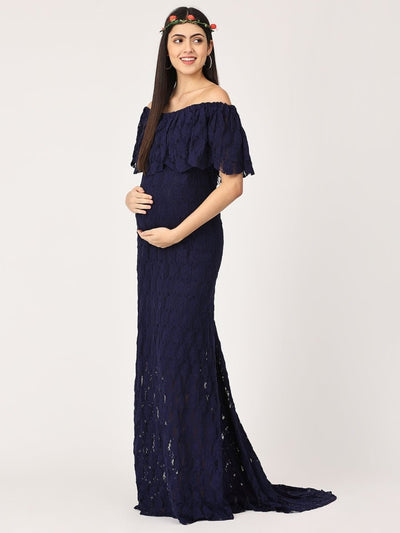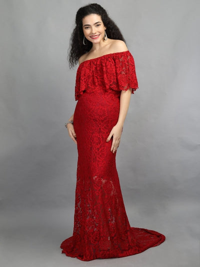 This splendid petal peach coloured dress with soft lace ruffles at the off shoulder neckline is the go-to for your baby shower or maternity photo shoot. Crafted in stunning floral lace which is fully lined, this dress drapes beautifully over your curves.