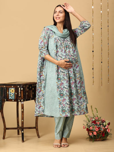 - Grey Printed Maternity and Nursing Kurta Set With Dupatta