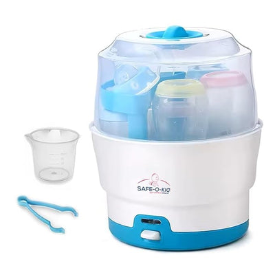Introducing the Safe-O-Kid Electric Steam Sterilizer, the perfect solution for busy parents who want to efficiently sterilize their baby's feeding bottles and accessories. With a large capacity for up to 6 bottles and other items like pacifiers and breast pump parts, it saves you time and energy. Utilizing steam to eliminate 99.9% of harmful bacteria, this sterilizer is free from UV and HEPA filters, ensuring thorough safety.