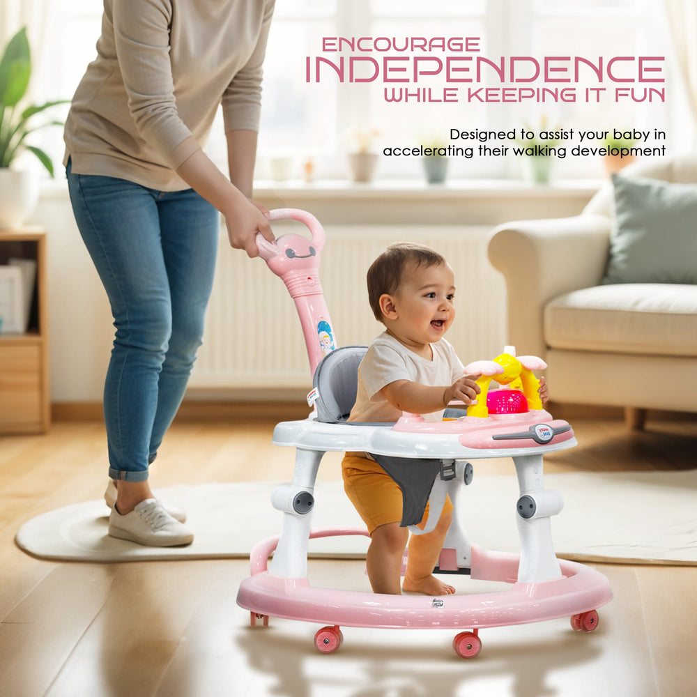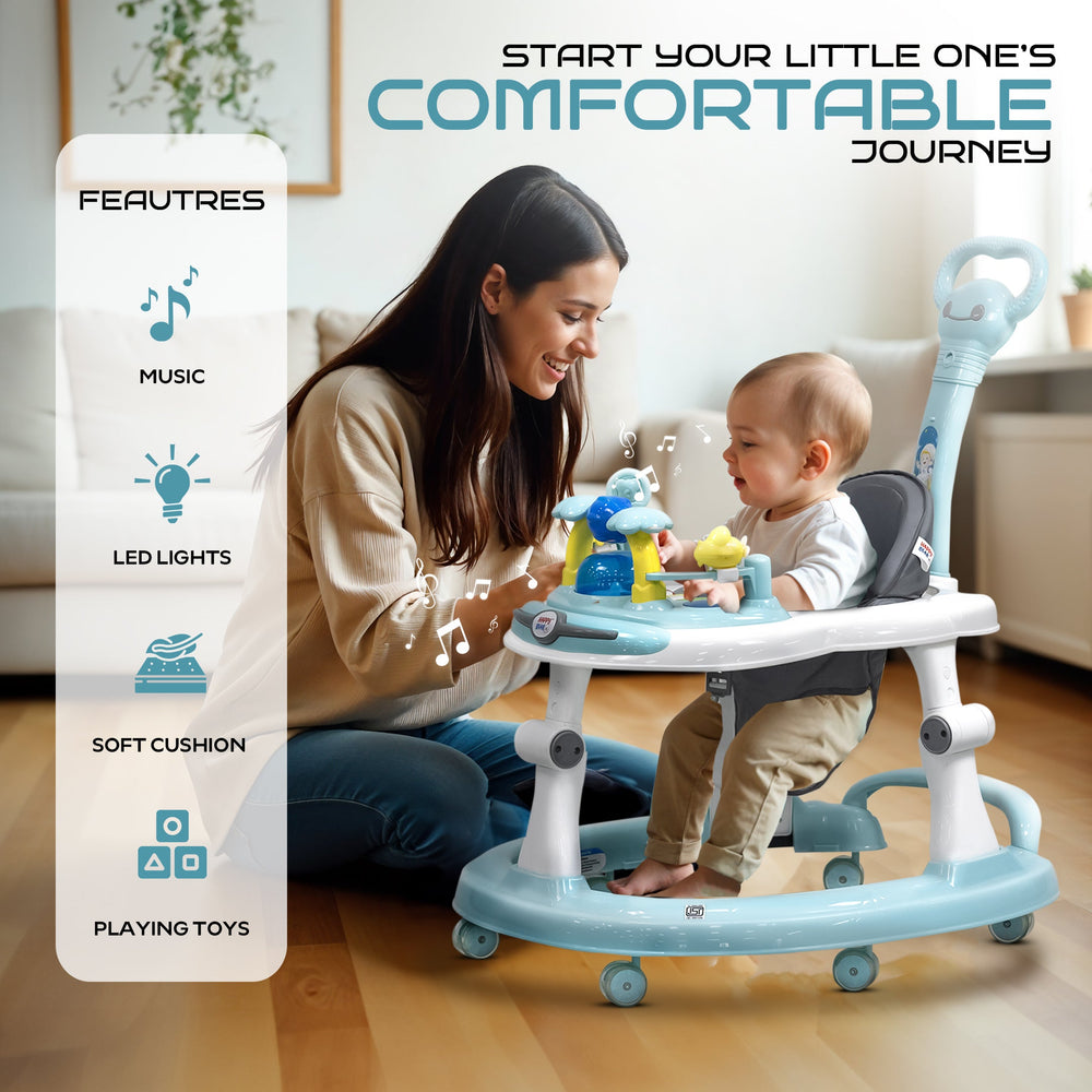 The Happy Bear Astro Baby Walker with a removable push handle is thoughtfully designed for babies aged 9 months and above. Its height-adjustable feature ensures comfort as your child grows, while the vibrant Astro design adds a touch of fun. Equipped with a detachable music tray and funky toys. It comes with a universal wheel; it keeps your baby entertained and engaged. The foldable design ensures easy storage, and the removable, adjustable baby seat offers convenience for parents. Whether at meal or playtime, this walker provides a safe and enjoyable experience with fun music and lights.