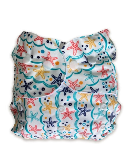 - Waist Adjustment: The cloth diaper has rows of adjustable waist snaps to fit different waist sizes.
