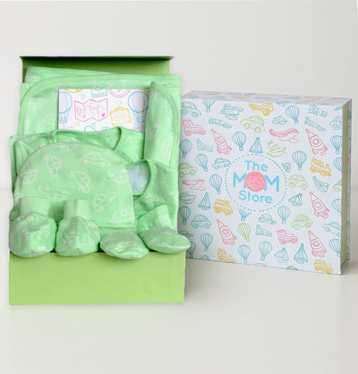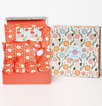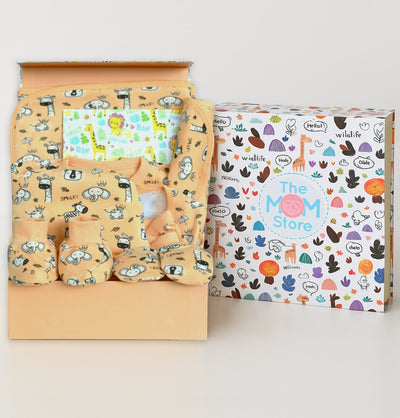 The Mom Store presents a Multi-Piece Gift box for Babies. Unwrap the joy with our brand-new curated gift box packed with love and premium quality. Set contains One Romper, One matching set of Cap + Mittens + Booties, Two Nappies, Two Napkins, One Burp Cloth, One Bib, One Milestone Cards and One Hooded Blanket. The prints on this set are fun and attractive. Made from cotton, this combo set ensures optimum comfort.