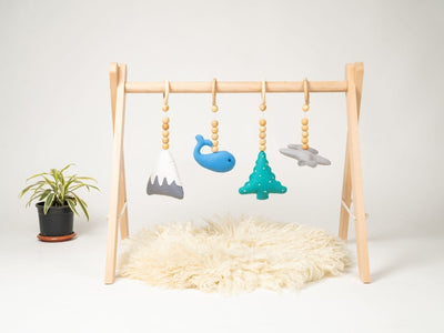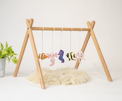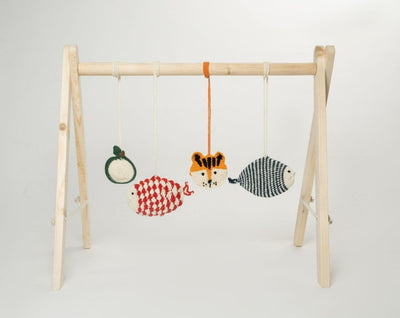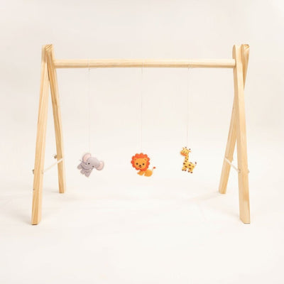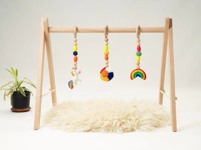 Baby gyms helps baby to attain the early milestones of life. Baby learns to grasp and hold the attached hanging toys, roll on the sides, explore the textures, and thus attain confidence about the surrounding in which they live. They are a great help to develop the gross motor skills in baby. Baby also learns cause and effect. This baby gym is easy to assemble. One can add his/her favorite toys to this baby gym. This baby gym comes with 4 beautiful and colorful cloud, star, sun and moon shaped hanging toys as shown in the image. These can be easily removed and used during tummy time of the baby. Also they can easily attaché to the stroller, pram, and crib. It is great gifting option for the newborn baby and a new mom. The hanging toys are made of Polyfill felt.