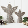 Adorn your holiday decoration with grace and serenity with ELENA, pack of 2 Filigree Peace Angel Ornaments by SWEN. This enchanting set includes two distinct sizes of angels, both crafted from metal and featuring an intricate, delicate cut-out design that beautifully catches the light. Angels are a classic, meaningful motif, making these ideal for traditional, spiritual, or vintage-themed Christmas decor. ELENE'S timeless style adds a touch of rustic elegance and spirituality to your holiday decor. The metal is expertly cut with a beautiful scrollwork, allowing the light from your tree to shine through for a soft, glowing effect, almost like divine intervention. Both the angel hangings are equipped with a small hard loop on top in order to faciliatate hanging and is extremely light weight to work perfectly as a versatile ornament. Use them as a decor item or as a tree ornament and be proud to show off the most unique christmas goodies this season.