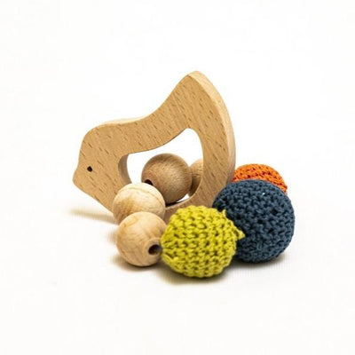 Features:- This Rattle cum teether is made of Natural Beech wood and sensory balls made up of ( cotton/ wool ) yarn. Its free from any harmful chemicals.