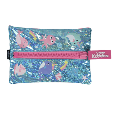 The Unicorn of the Sea! This sweet little narwhal sparkle pencil case will make you smile every time you see it. Embossed narwhale design complements your fun and spirited style everywhere you go! This big zippered pencil case is designed to use when a smaller size just isn't enough for all those pens, pencils and art supplies you use. Don't limit its uses though, you can put a wide range of things.