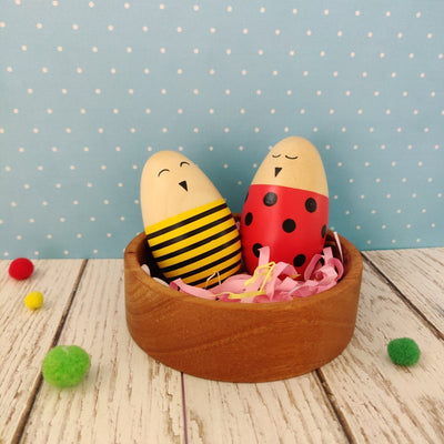 Smooth and colourful wooden egg-shaped rattles made of natural wood with little organic beans inside to make pleasing sounds to hold a baby's attention.