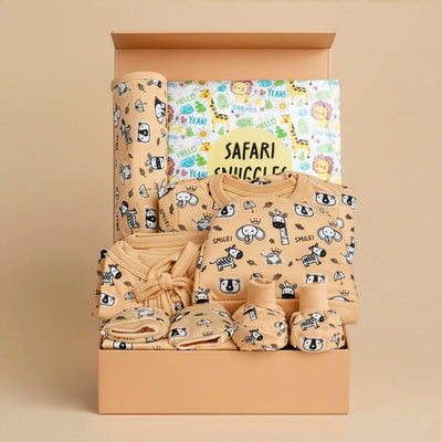 This thoughtfully designed set contains 1 Romper, 1 Bib, 1 Burp Cloth, 2 Nappies, 1 Mitten–Booties–Cap Set, and 1 set of Milestone Cards. Featuring attractive and delightful prints, this combo makes a wonderful gift for newborns and a complete starter set for everyday baby essentials.