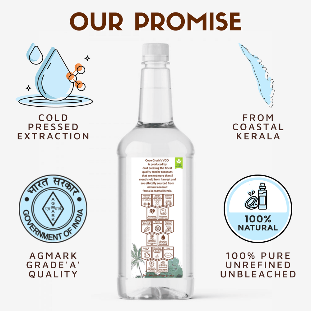 Indulge in the pure goodness of Coco Crush Cold-Pressed Virgin Coconut Oil. This pack of two is perfect for versatile use in skincare, haircare, and cooking. Enjoy its natural aroma and nourishing benefits in every drop!