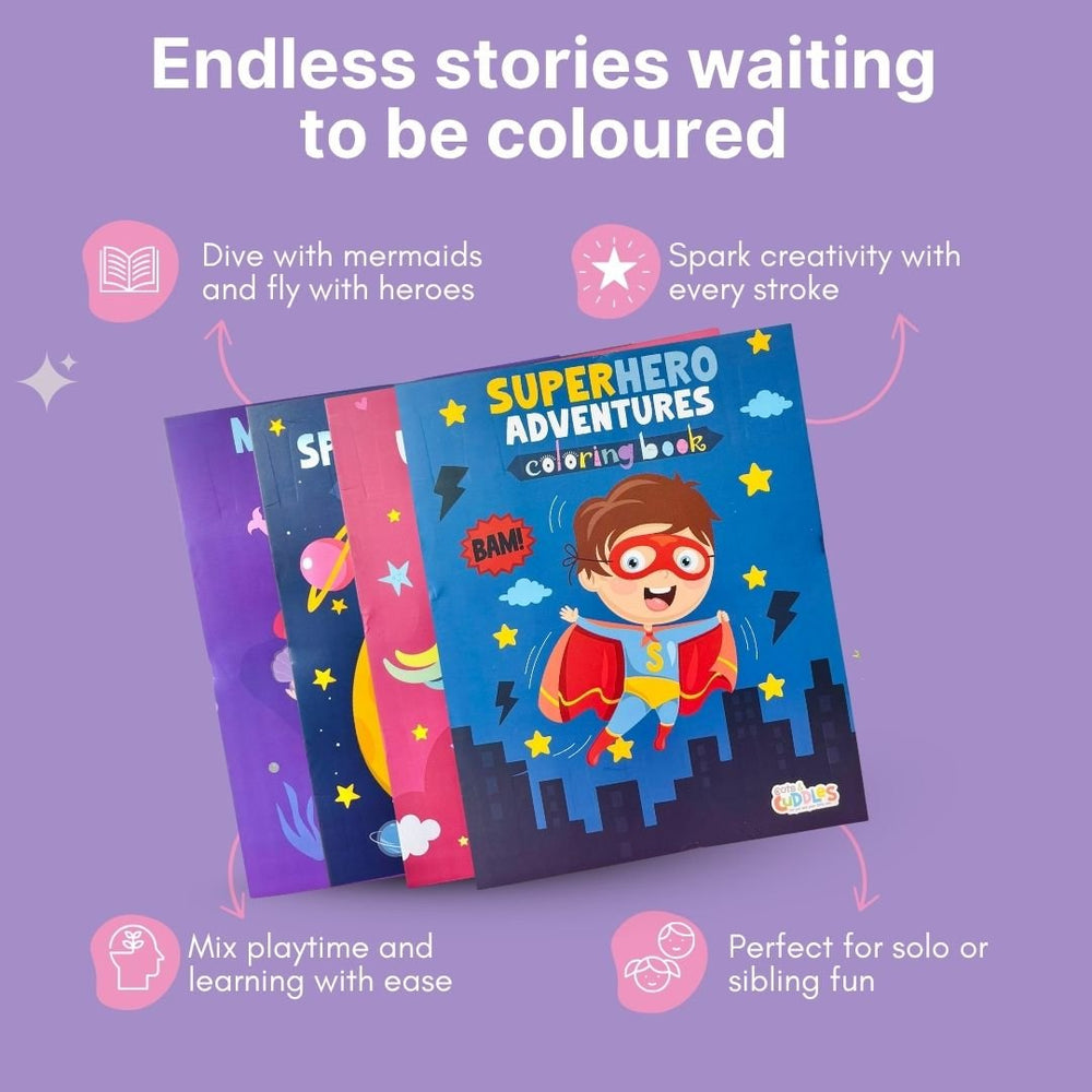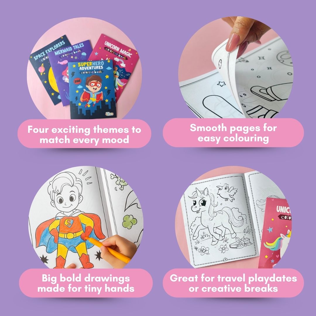 - Single Theme Colouring Book – Choose from 4 exciting themes: Superhero, Astro, Mermaid, or Unicorn – each sold separately.