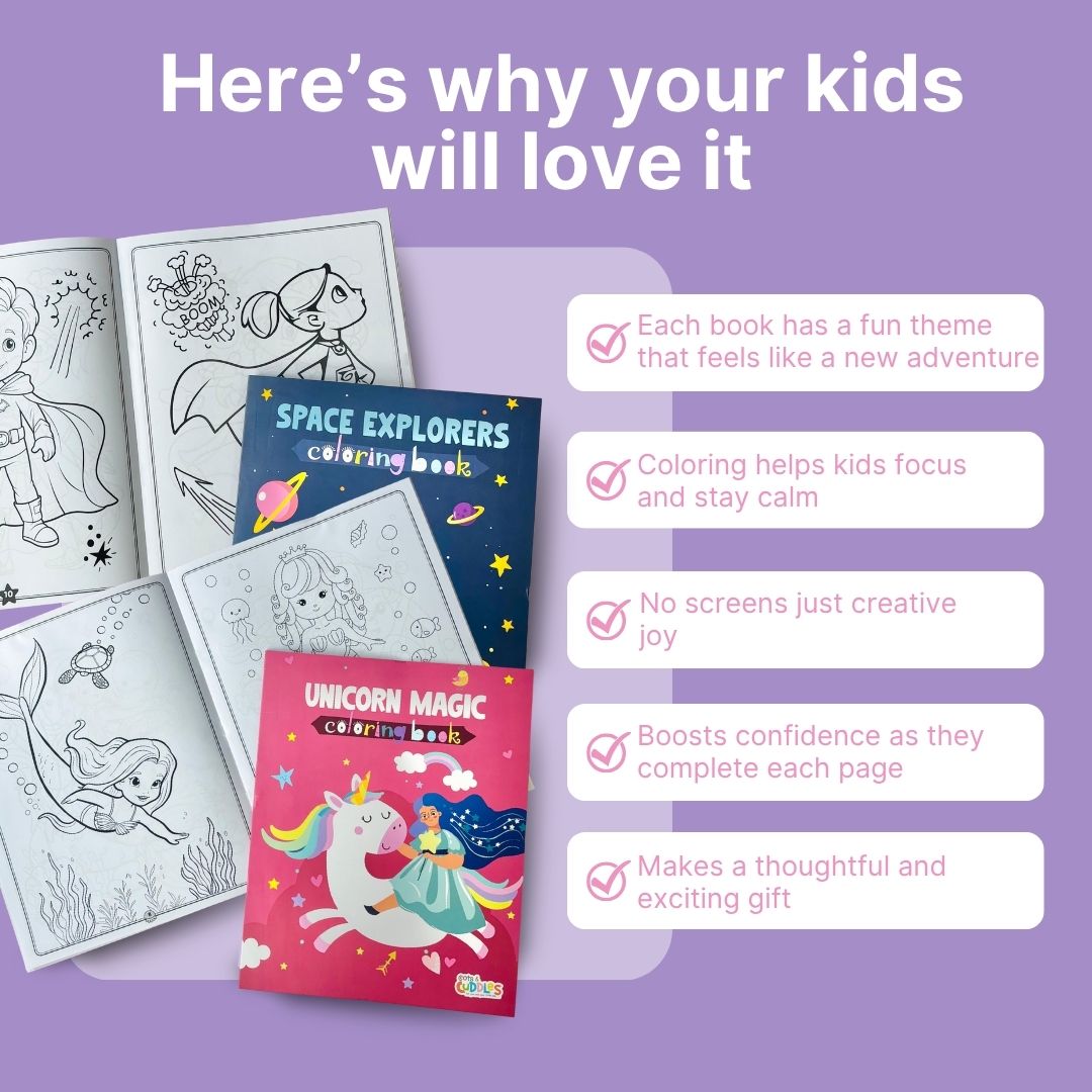 Cots and Cuddles Unicorn, Space, Mermaid & Superhero Theme Colouring Book for Kids