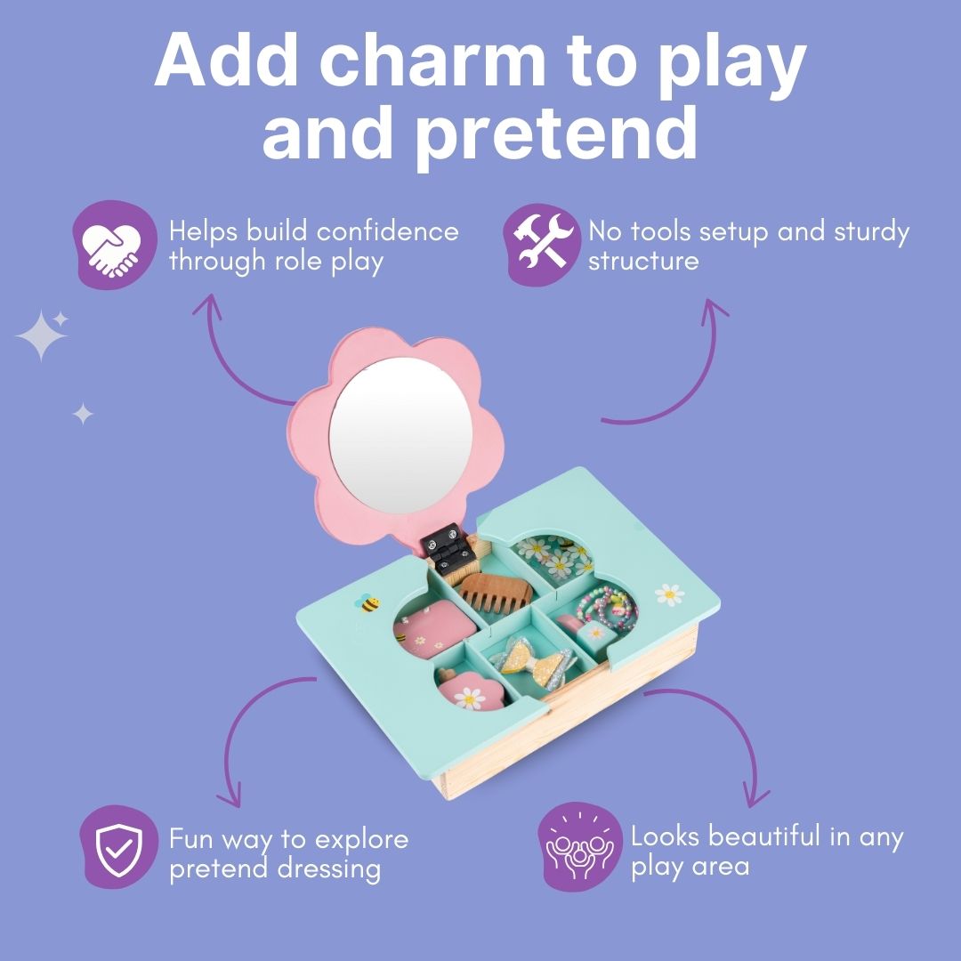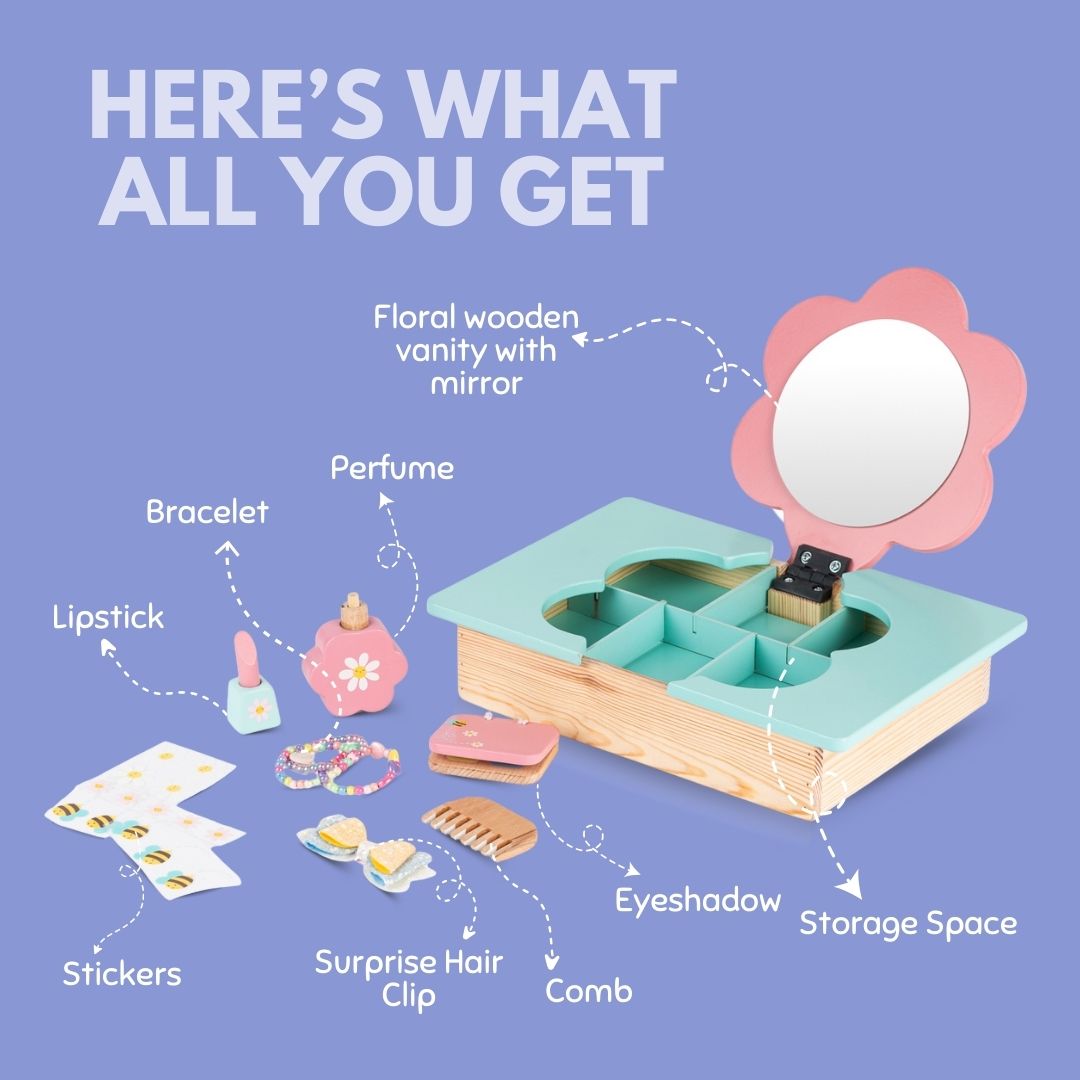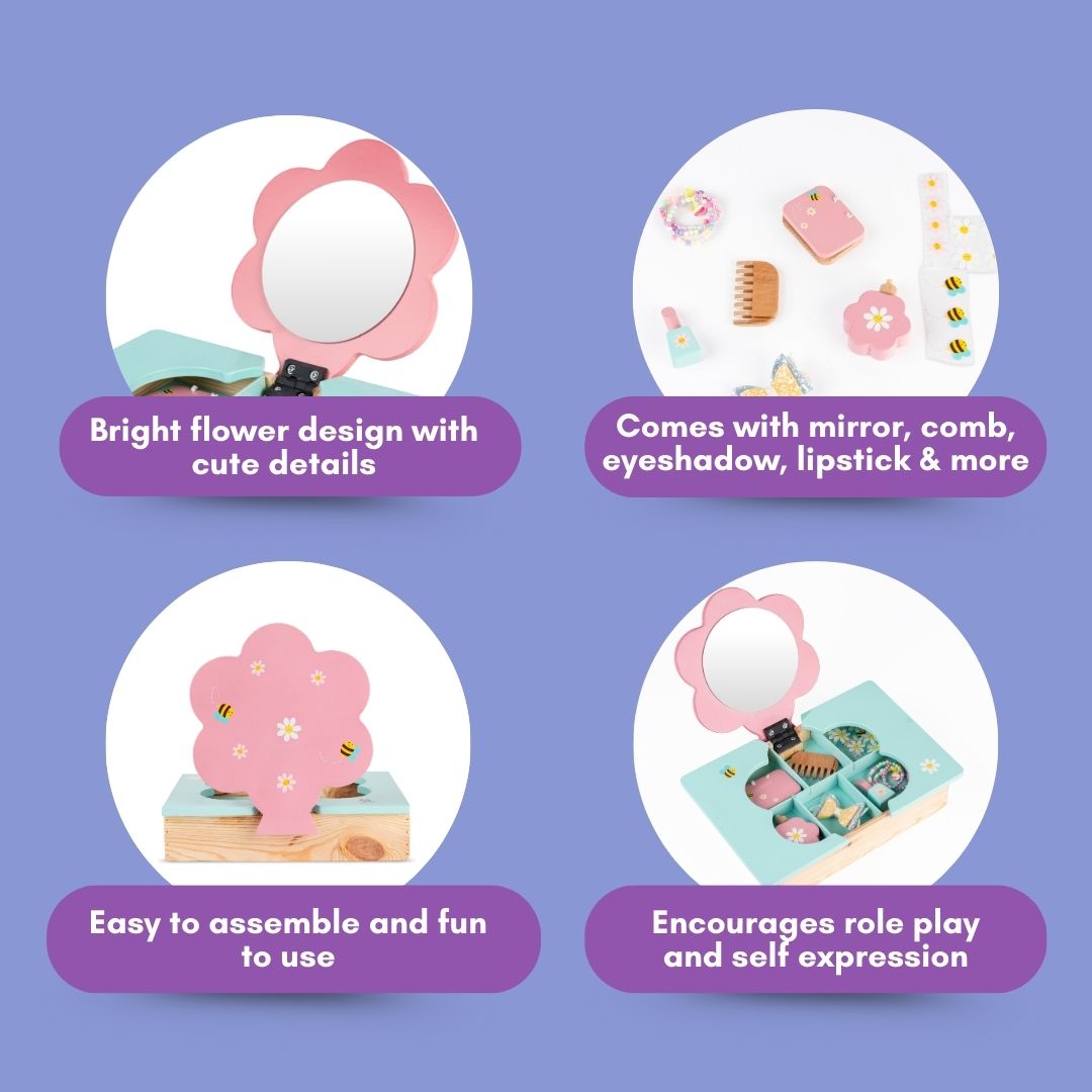 - Wooden Dressing Table Playset for Kids – Beautifully crafted pretend play vanity set with flower-shaped mirror and storage compartments.