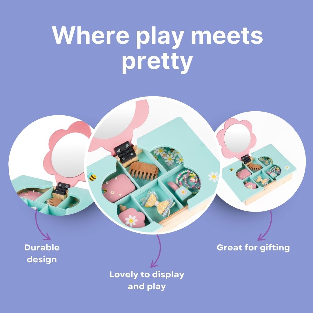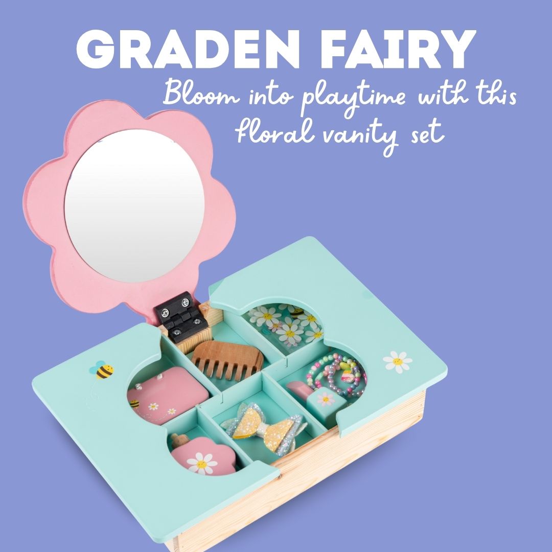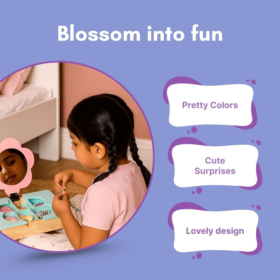 - Wooden Dressing Table Playset for Kids – Beautifully crafted pretend play vanity set with flower-shaped mirror and storage compartments.