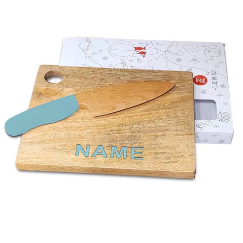 A Montessori knife and board set is a child-friendly kitchen tool that is designed for the Montessori educational approach. It includes a safe wooden knife with smooth edges and a customized cutting board, allowing children to practice food preparation skills.