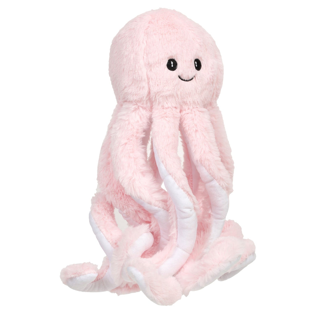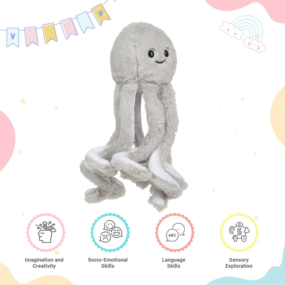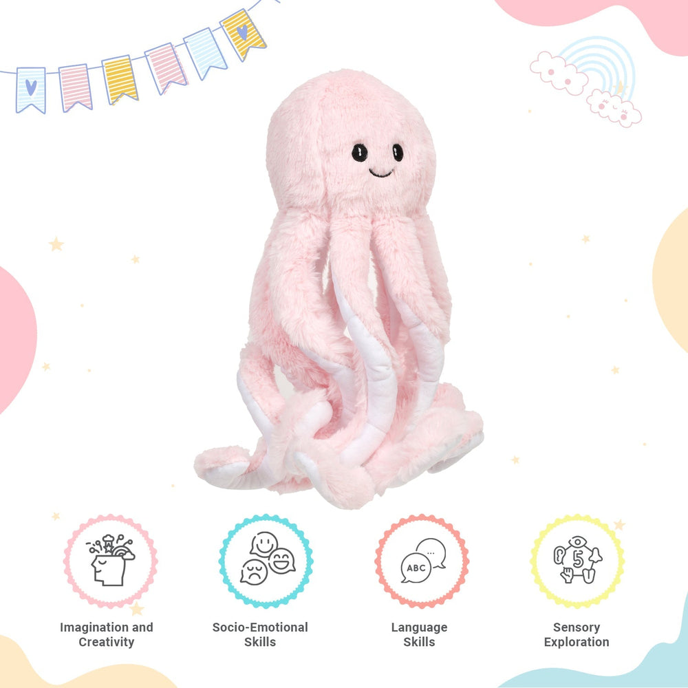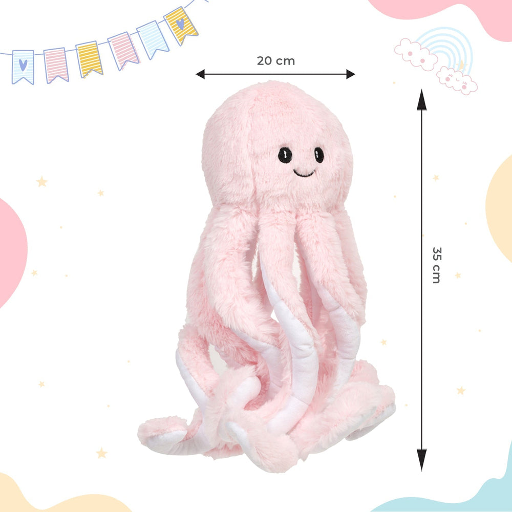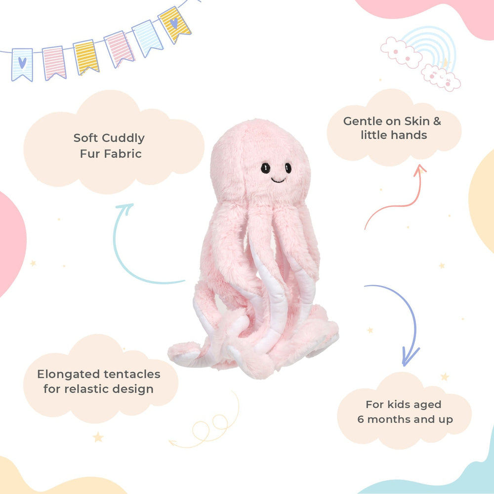 Introduce beach and sea adventure in your child's platime with meticulously designed Pink Octopus soft toy. The fabric of our octopus pluh toy is soft fur fabric which is gentle on little hands adn non-toxic. Our soft toy collection is designed to offer warm cuddly time to kids. The octopus features eight elongated soft tentacles potraying realistic details to enhance the playtime. It is lightweight and easy to be carried along on trips to turn everytime with your kids into a loving time. Our Octopus stuffed toy is best cuddling companion for kids aged 6 months and above. It has no sharp material or any harmful material. The child can build creative stories around the Octopus toy hence improving ont heir imagination skill. It ehnaces child's sensosry skills as the child explores through the soft fabric.