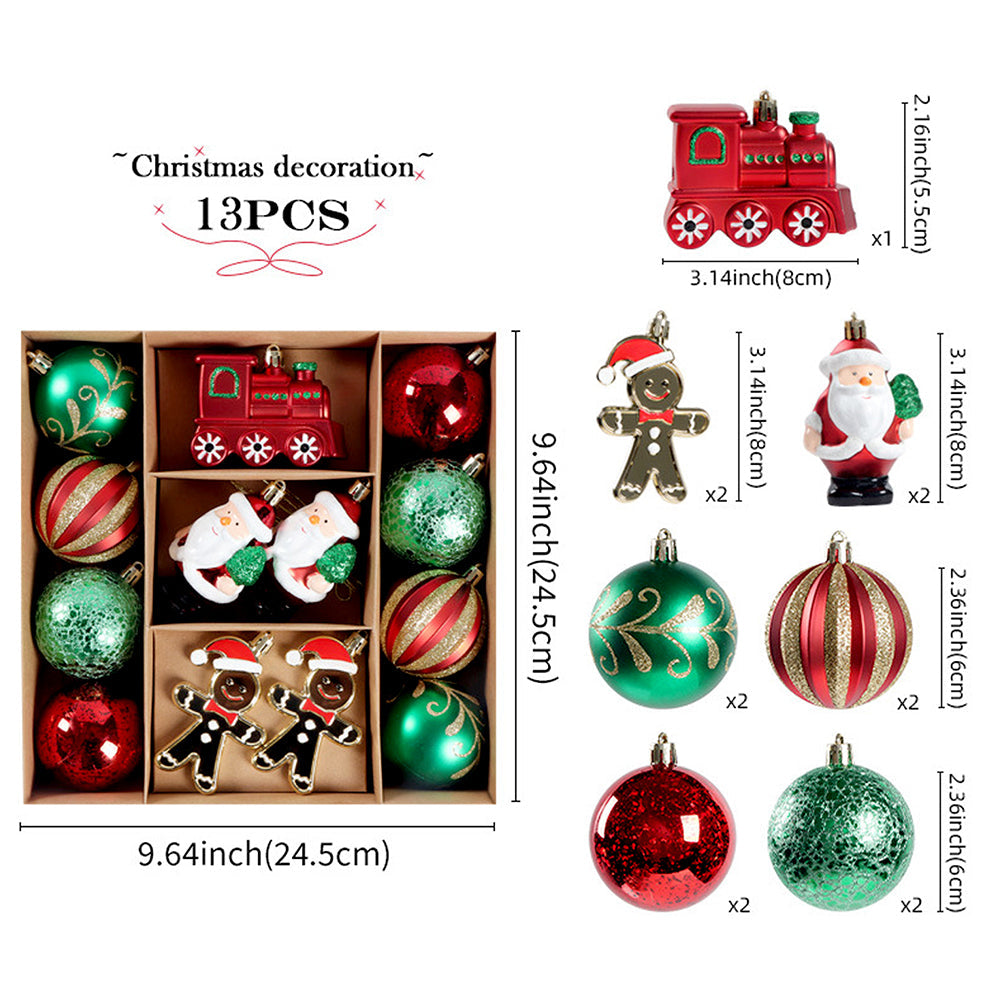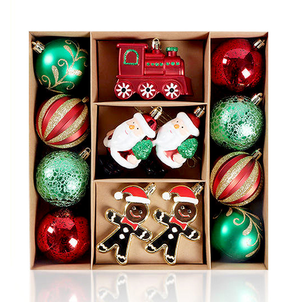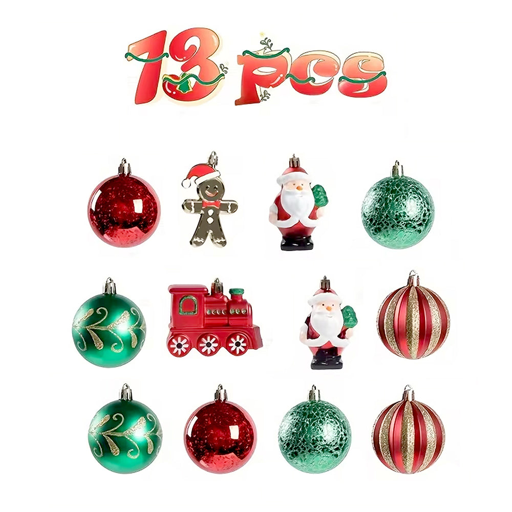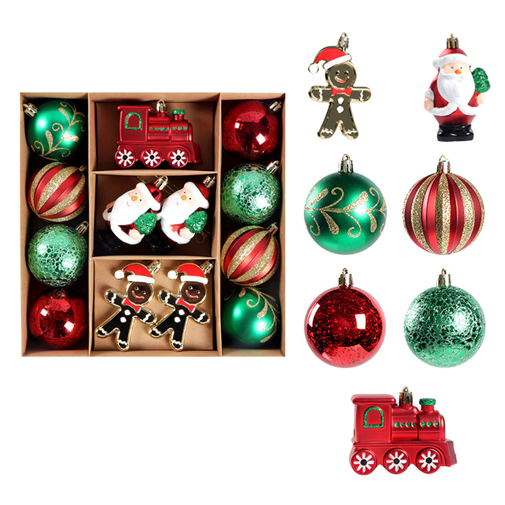 - 18 pcs Christmas Decoration Balls Set: A charming, premium Santa Gingerbread Train themed Christmas decoration set featuring 18 festive ornaments. Designed in vibrant red, green, and gold tones, this joyful assortment includes baubles, character figurines, and playful Christmas icons.