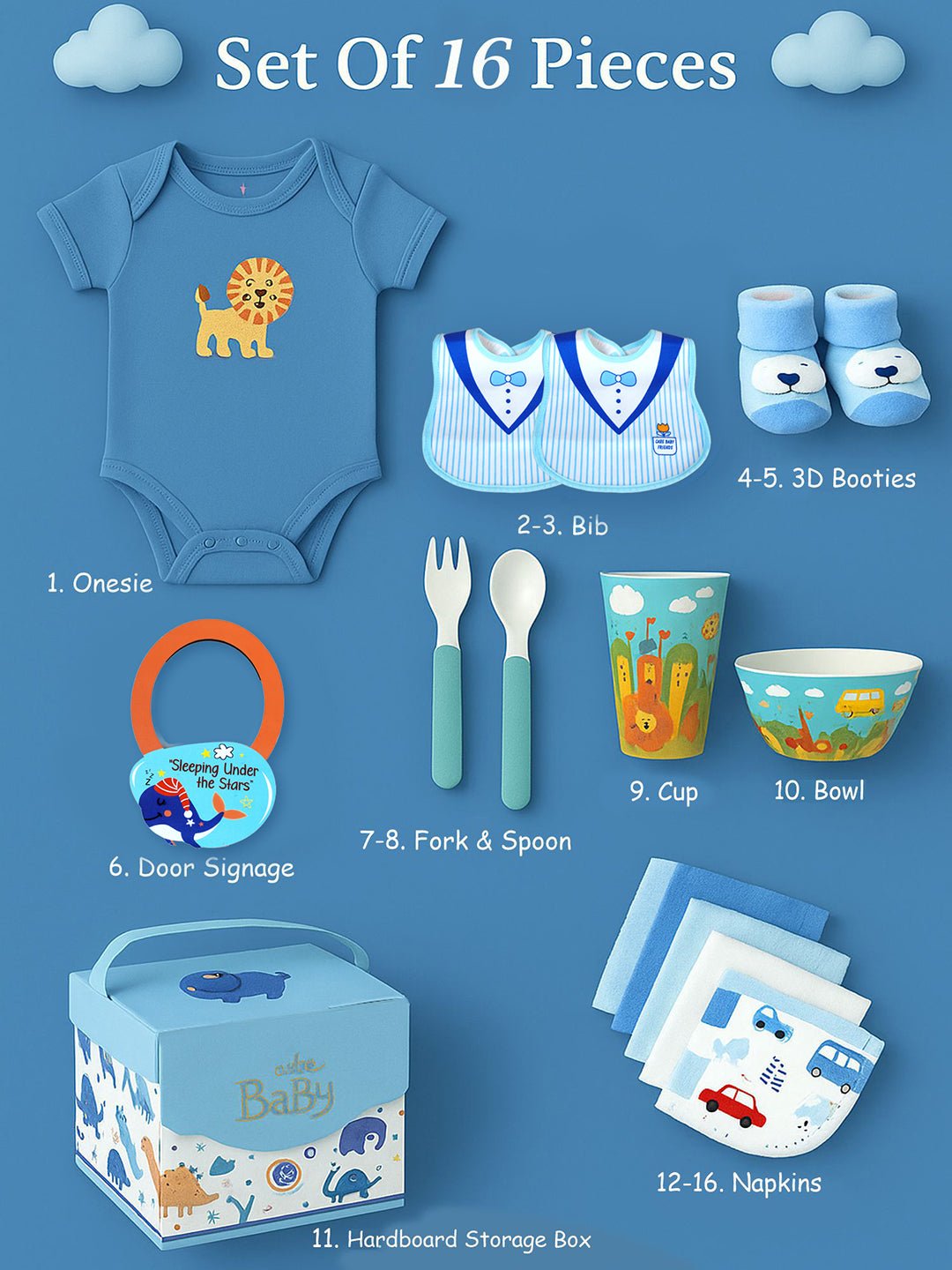 • 16 Pcs Assorted Gift Hamper Set: This stunning 16 pcs Gift Hamper set is a beautiful assortment of exclusive essentials for a baby boy. This hamper includes • 1 Hardboard Storage Box • 1 Beautifully printed onesie •1 Door Signage •1 Bamboo fibre Feeding Bowl • 1 bamboo fibre spoon and fork set •1 matching Bamboo fibre cup• 5 Napkins • 2 Bibs • 2 booties.