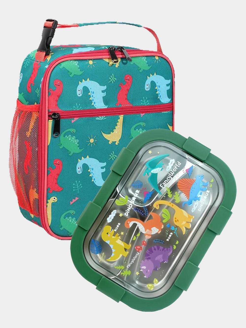 - 2pcs Matching Lunch Box and Lunchbag: A great and compact 3 section compartment lunch box with a matching Lunch bag in an attractive Dinosaur print which makes it stand out from the regular prints available in the market.