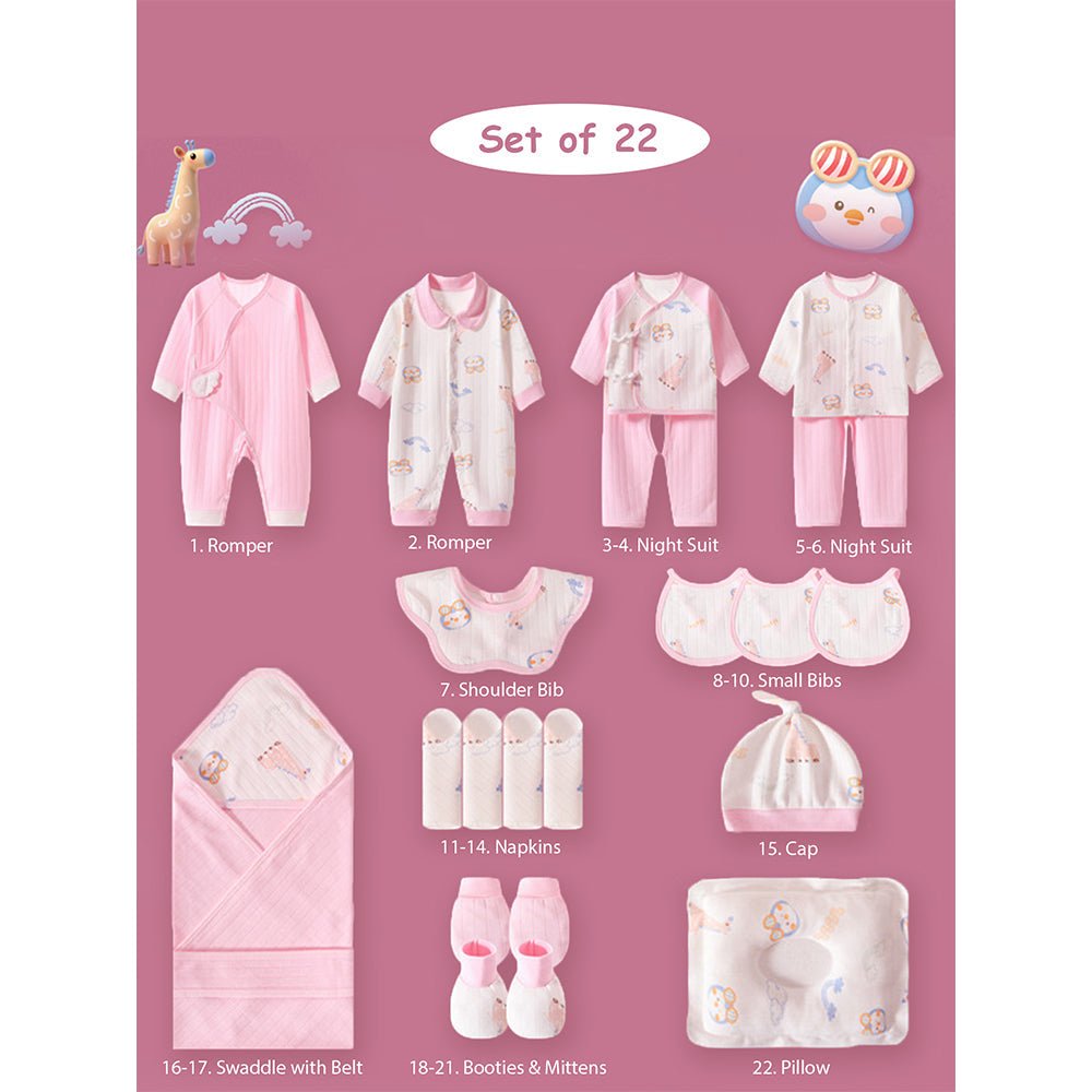 - A 22 Pcs Soft Organic Cotton Assorted Gift Hamper Set: This stunning 22 pcs Gift Hamper set is a beautiful assortment of exclusive essentials for a baby. Its difficult to think about a wholesome and still unique gift to your little loved one. Newborn Hampers from Little Surprise Box solves this gap and bring in an uniqune, fresh and premium luxury quality hamper designed for the little one. This hamper includes 1 Pillow,1 Pair Mittens,1 Pair of Gloves,1 Swaddle, 1 Belt,1 Button Romper,1 Printed Button Romper,1 Lace Shirt,1 Diaper Changeable Pants,1 Button Shirt,1 Full Pant,1 Cap,4 Napkins,1 Big Button Bib, 3 Lace Bib.