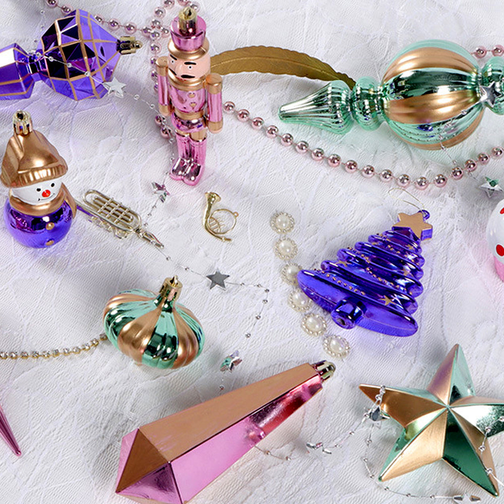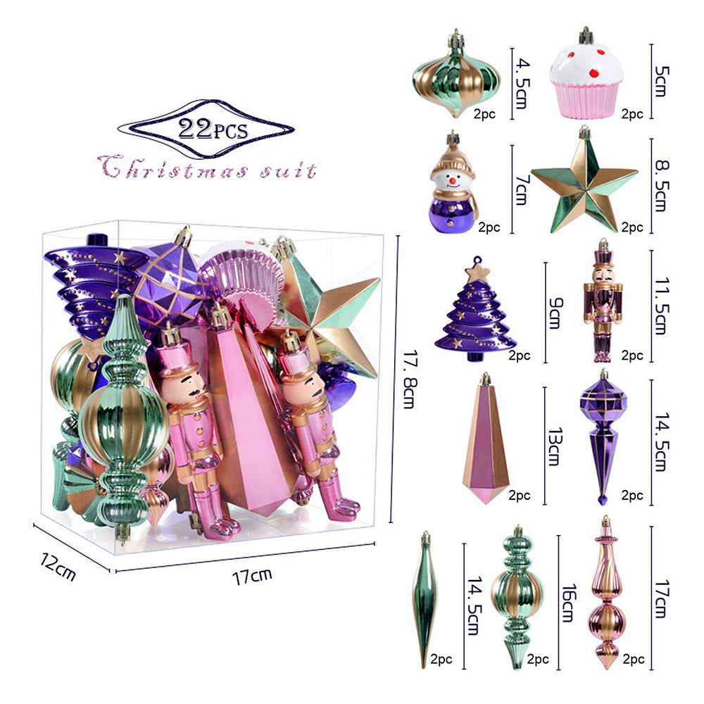- 22 pcs Christmas Decoration Balls Set: A unique, premium Pink, Purple & Mint themed Christmas decoration set featuring 22 beautiful ornaments. Designed in quirky pastel festive tones, this exquisite assortment offers a stunning mix of long baubles, nutcracker figurines, geometric shapes, stars, cupcakes, and decorative Christmas icons.