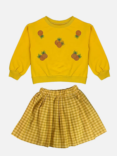 - 2 Pcs Set: Brighten up your little one's wardrobe with this adorable Girls' Pineapple Print Sweatshirt, Skirt Set. This 2-piece outfit includes a cozy sweatshirt with cute pineapple embroidery, a yellow checkered skirt for a fun and coordinated look.