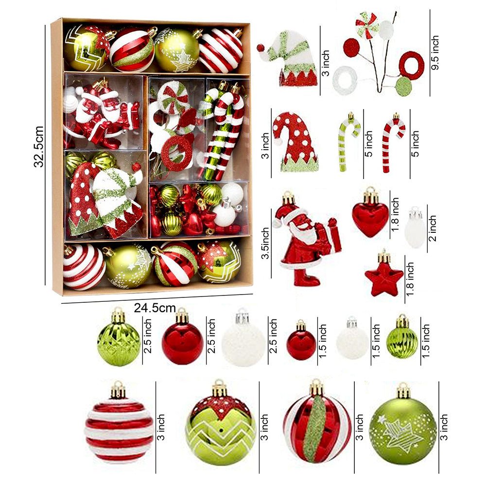 - Size: Every ball size is asorted and varied ranging from candy canes, elf hats, santas, swirl balls and so much more. It is suitable for decorating Christmas trees of all sizes.