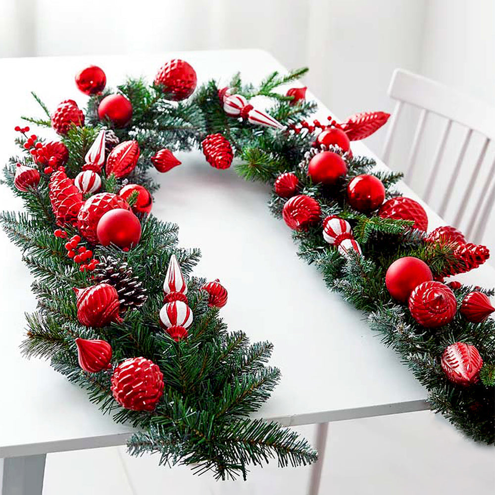 - Bushy Filled-Up 6.5 Feet Garland: This beautiful bushy garland comes heavily decorated with striking red Big , Large size baubles, textured ornaments, pinecones, berries, candy-swirl drops, and glossy festive accents. The deep green foliage combined with bright red detailing creates a bold, luxurious Christmas statement, perfect for modern, classic, or festive styling.