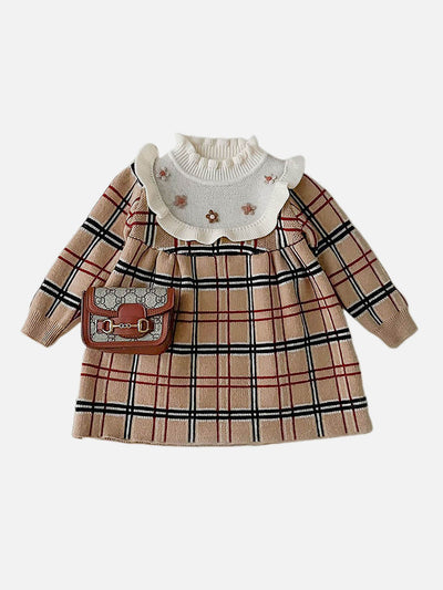 Little Surprise Box Beige sailor Checkered Collar Knitted Frock Winterwear for girls