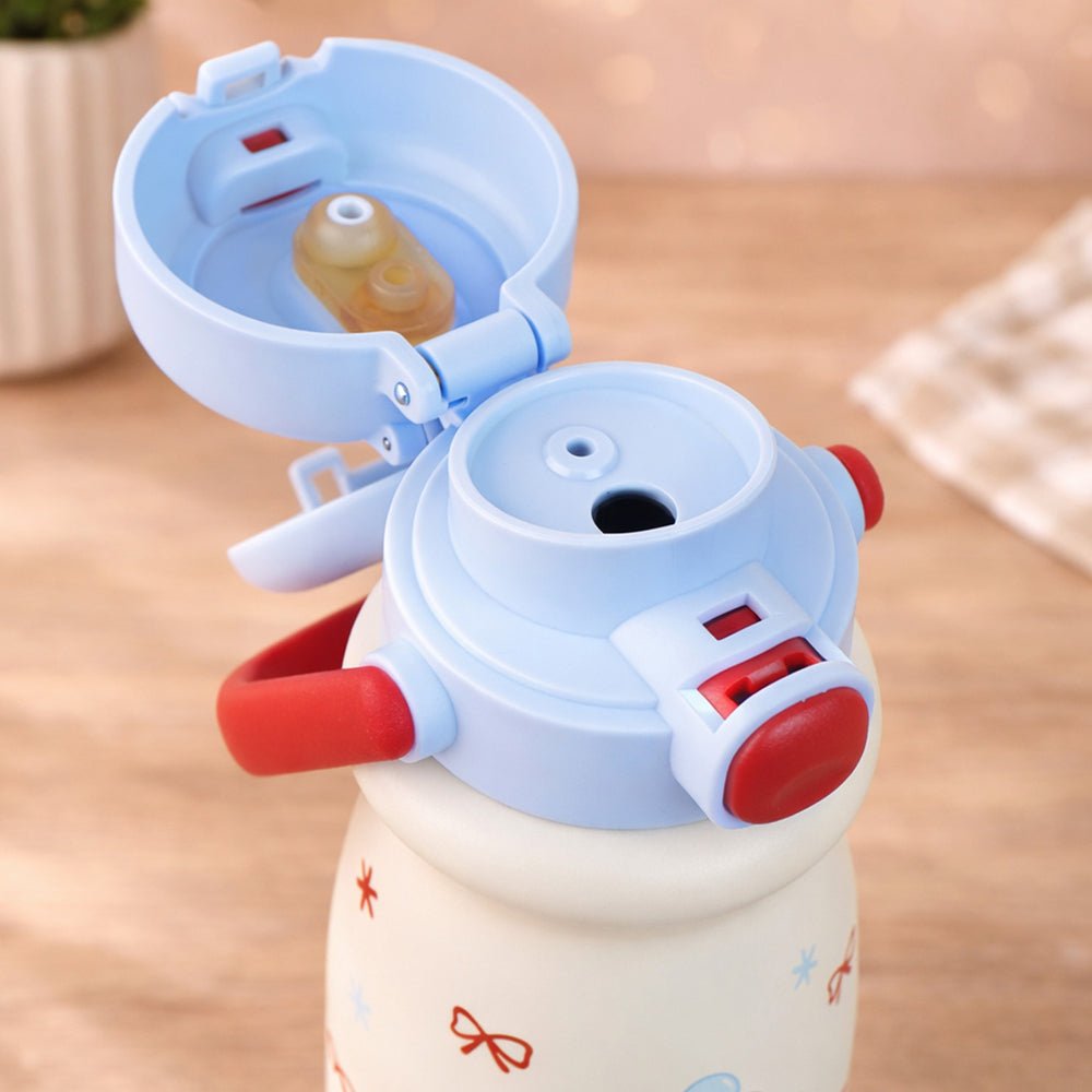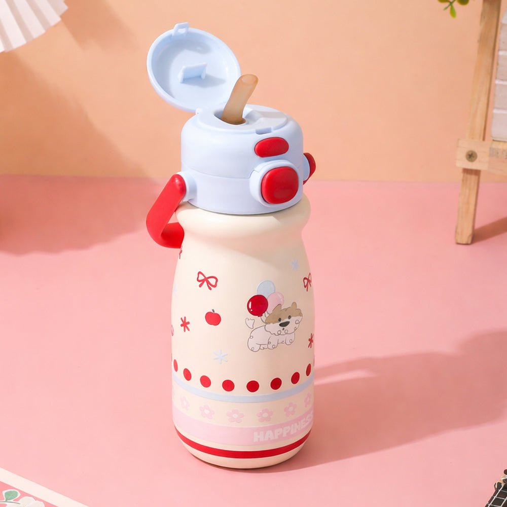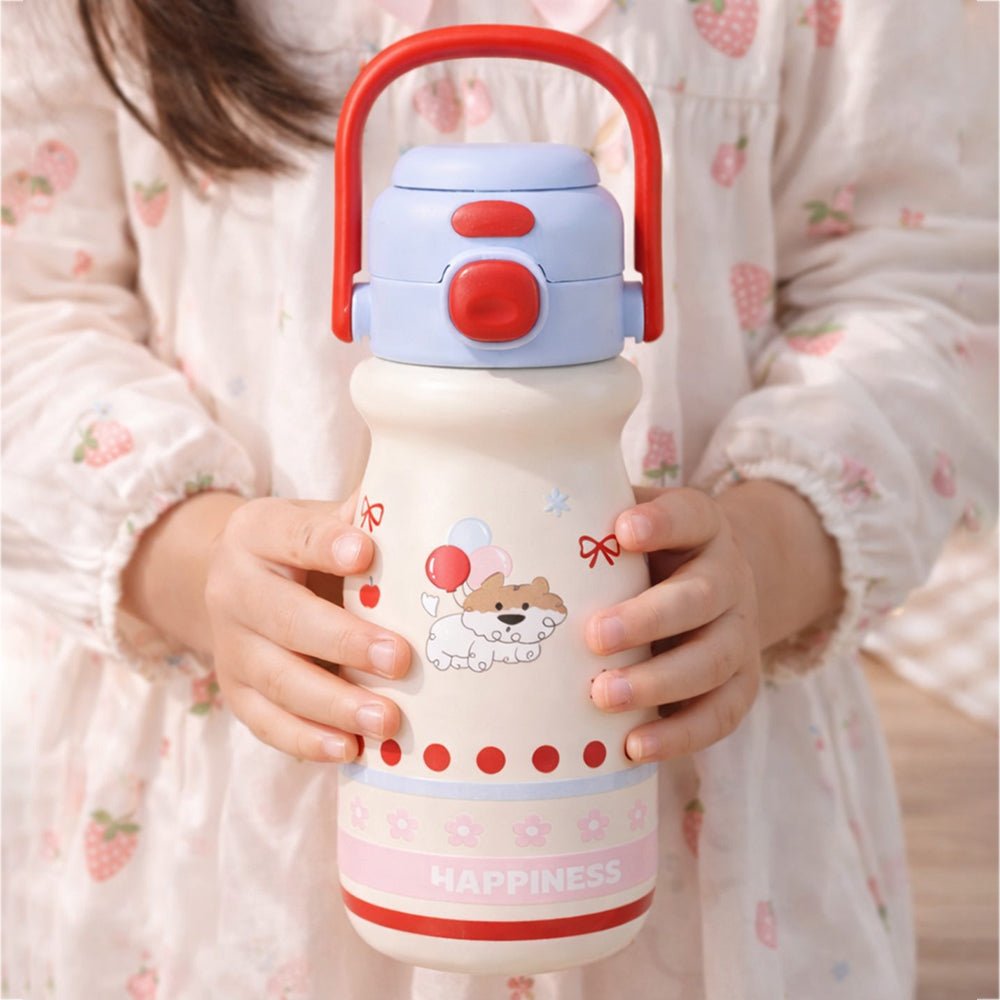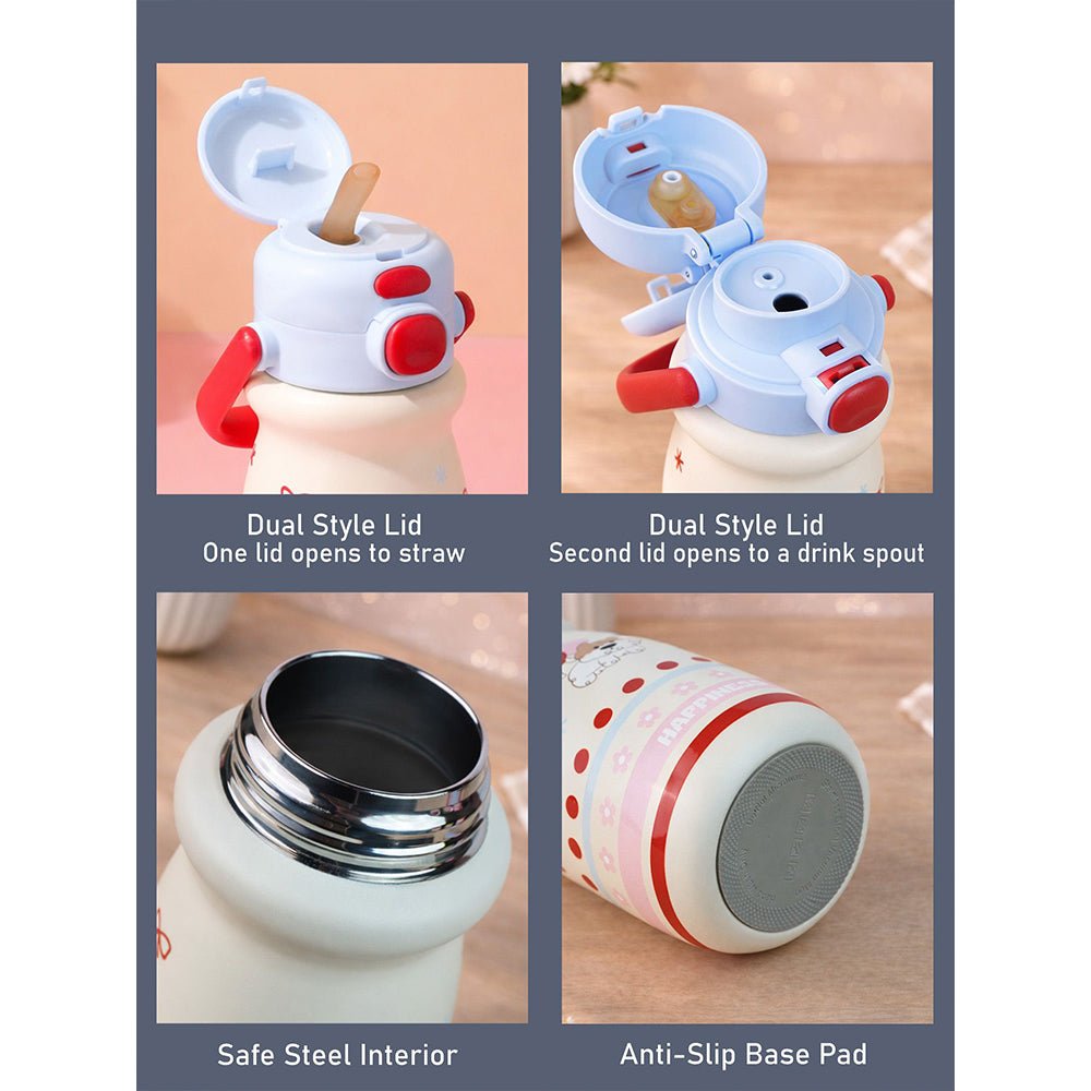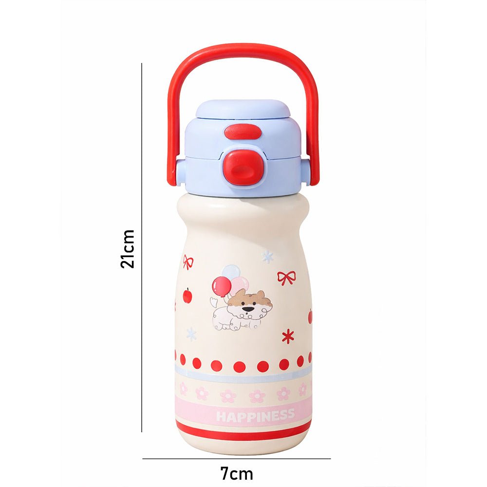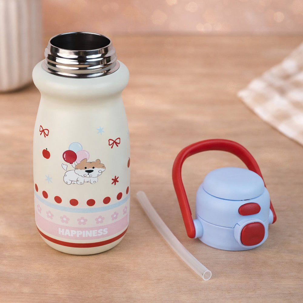 - Product Design: Featuring pastel stripes, an adorable character illustration, and the uplifting word “HAPPINESS” printed at the base, this bottle brightens your child’s mood instantly. Its compact shape makes it easy for little hands to grip securely.