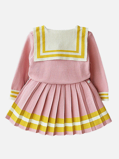 - Classic Sailor Design: Dress your child in this delightful Sailor-Style Bow Top and Pleated Skirt Set for a look that’s both cute and classic – perfect for any occasion. Features a sailor-style top with a large, decorative bow and striped details, adding a touch of nautical charm to your child's outfit.