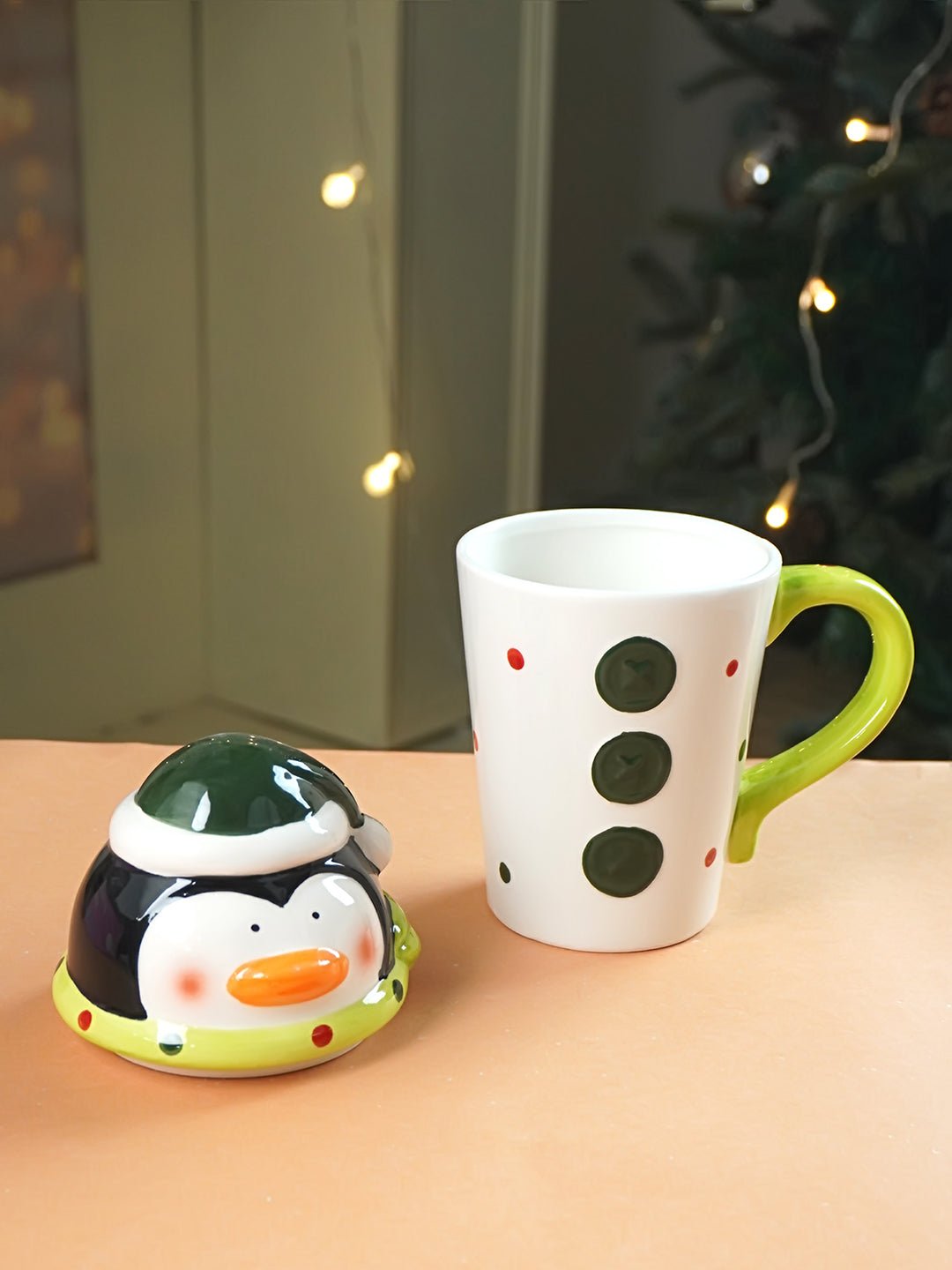 - Design: This beautifully handcrafted ceramic mug features a clean white body with festive red and green dot detailing inspired by cozy winter outfits. The soft green handle adds a gentle pop of colour. The highlight of the mug is its 3D Penguin Ceramic Lid, sculpted with a bright orange beak and a cosy winter cap.