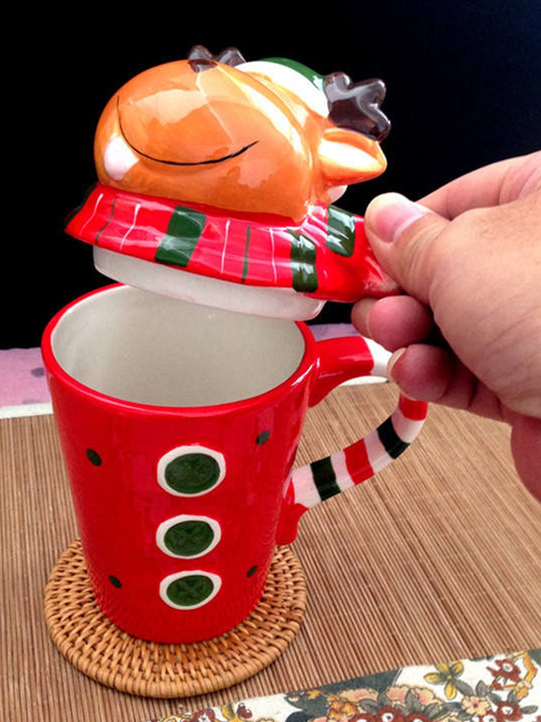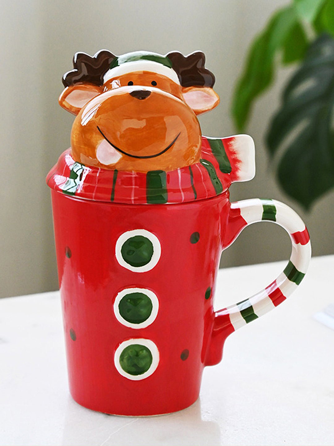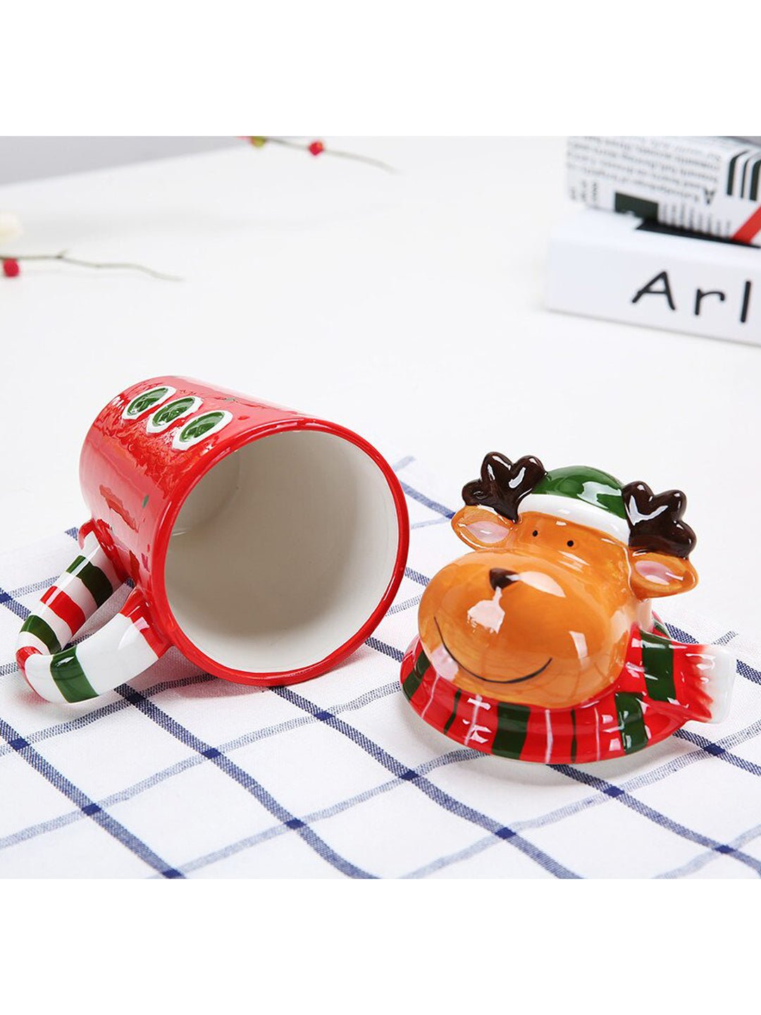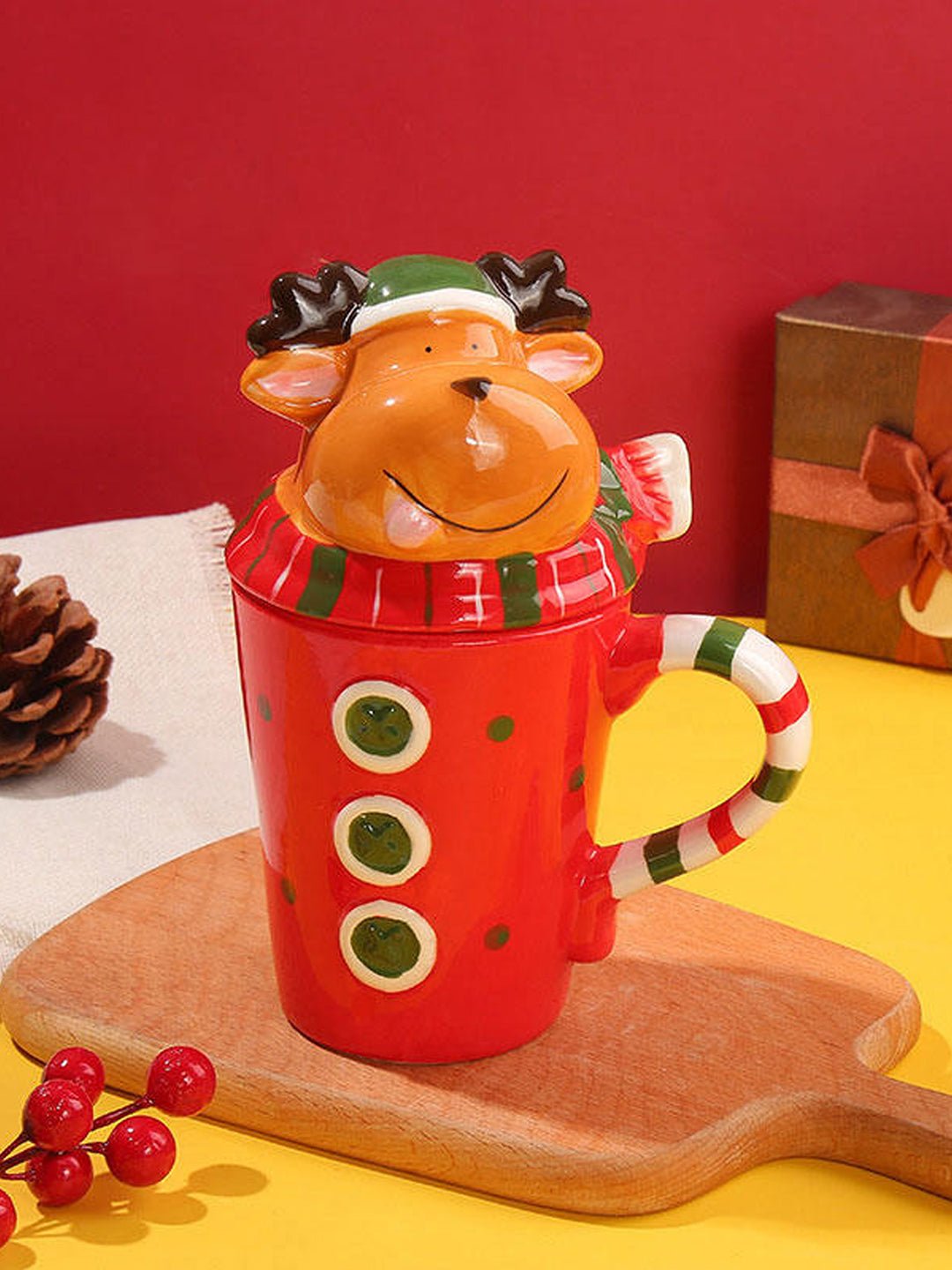 - Design: This beautifully handcrafted ceramic mug features a vibrant red body with button detailing inspired by classic Christmas outfits. The candy-striped handle adds a festive twist, while the highlight of the mug is its 3D Reindeer Ceramic Lid sculpted with adorable details that bring the character to life.