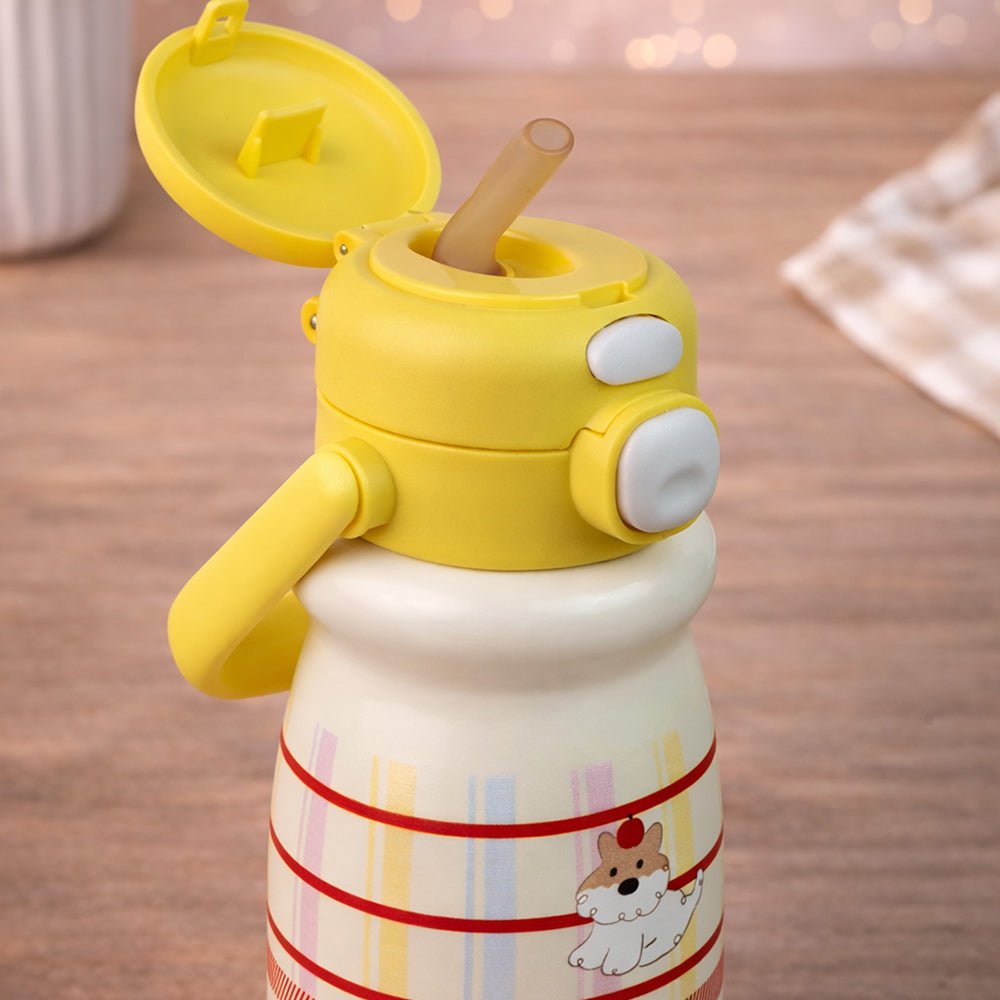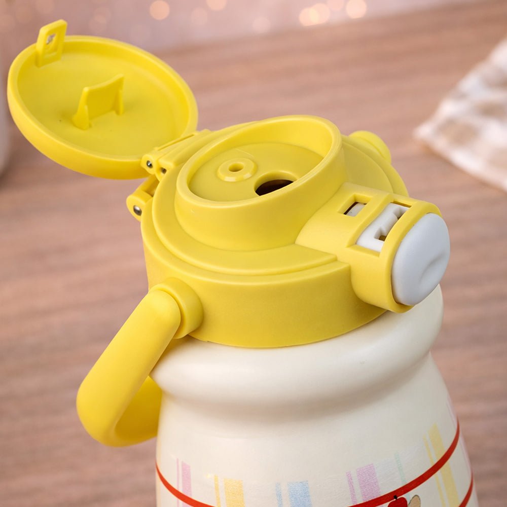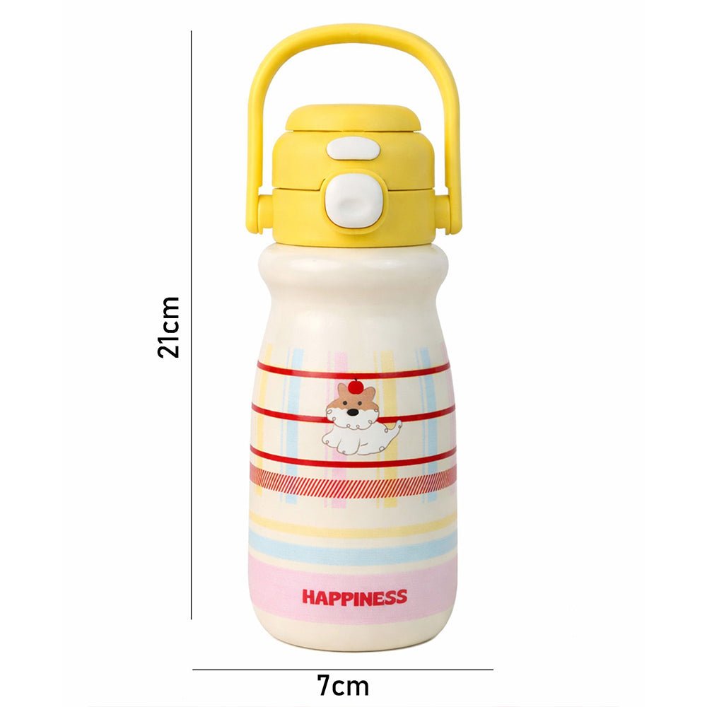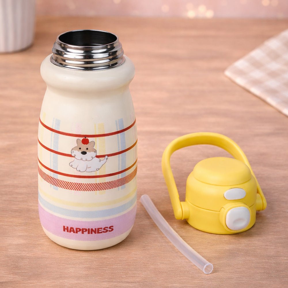 - Product Design: Featuring pastel stripes, an adorable character illustration, and the uplifting word “HAPPINESS” printed at the base, this bottle brightens your child’s mood instantly. Its compact shape makes it easy for little hands to grip securely.