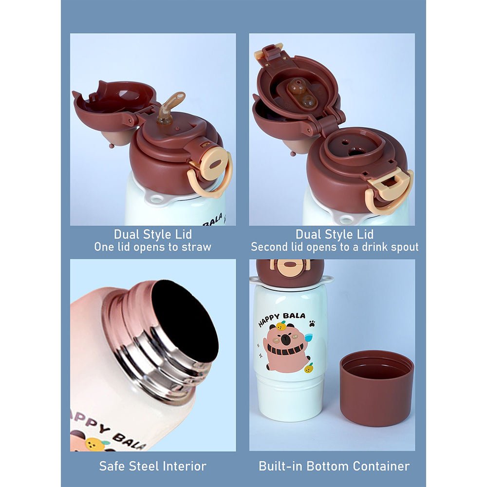 - Dual Feature Lid Design : This piece is uniquely designed where the child can sip the liquid either through a silicone straw or through a wide mouth. It also has a unique feature of a bottom container below the bottle which fits in well, looking like a part of the bottle. The child can transfer some snacks or use this container to pour in a hot beverage.