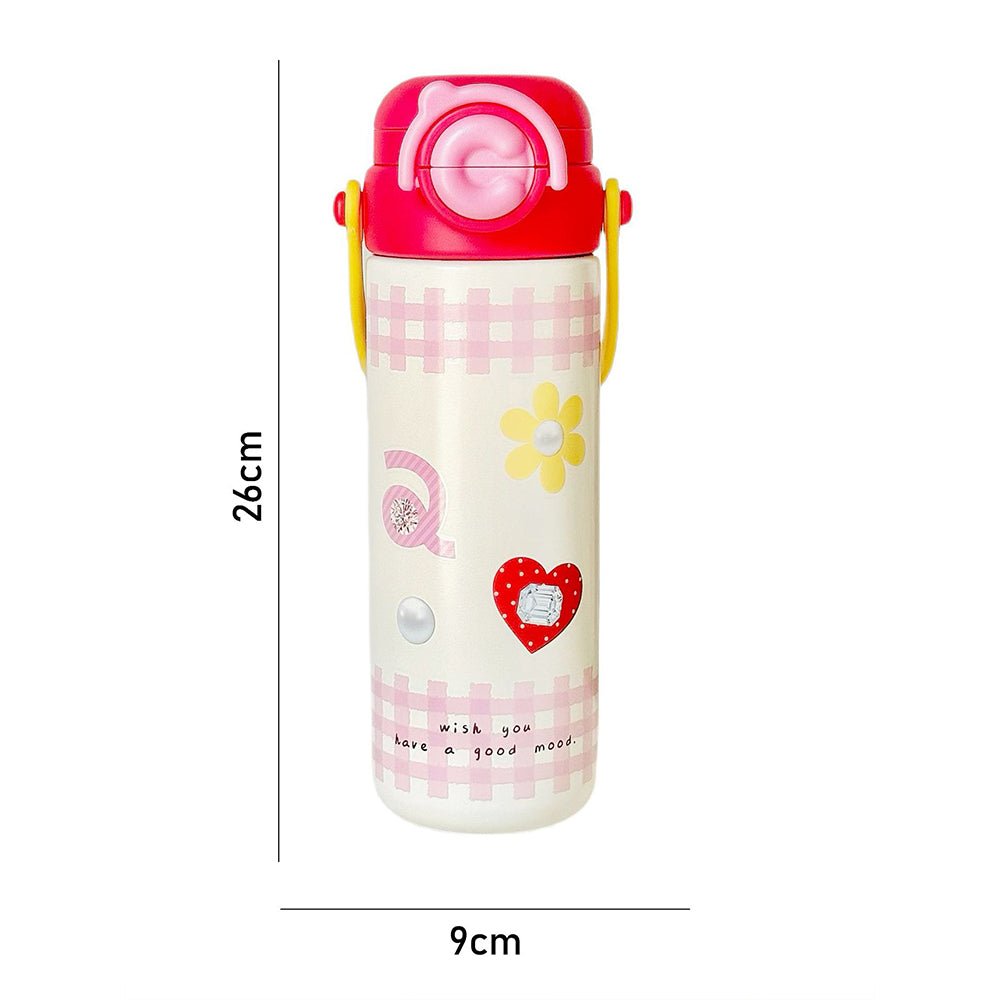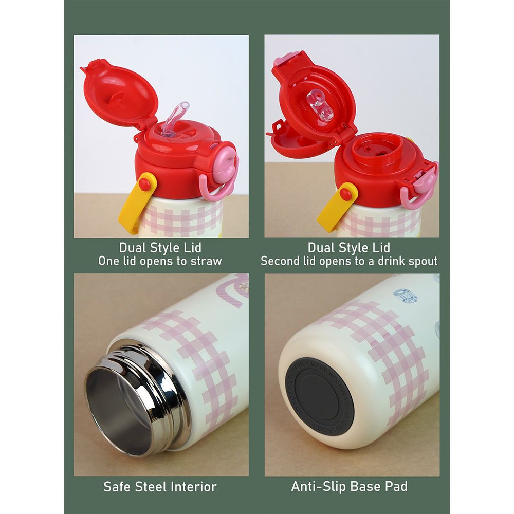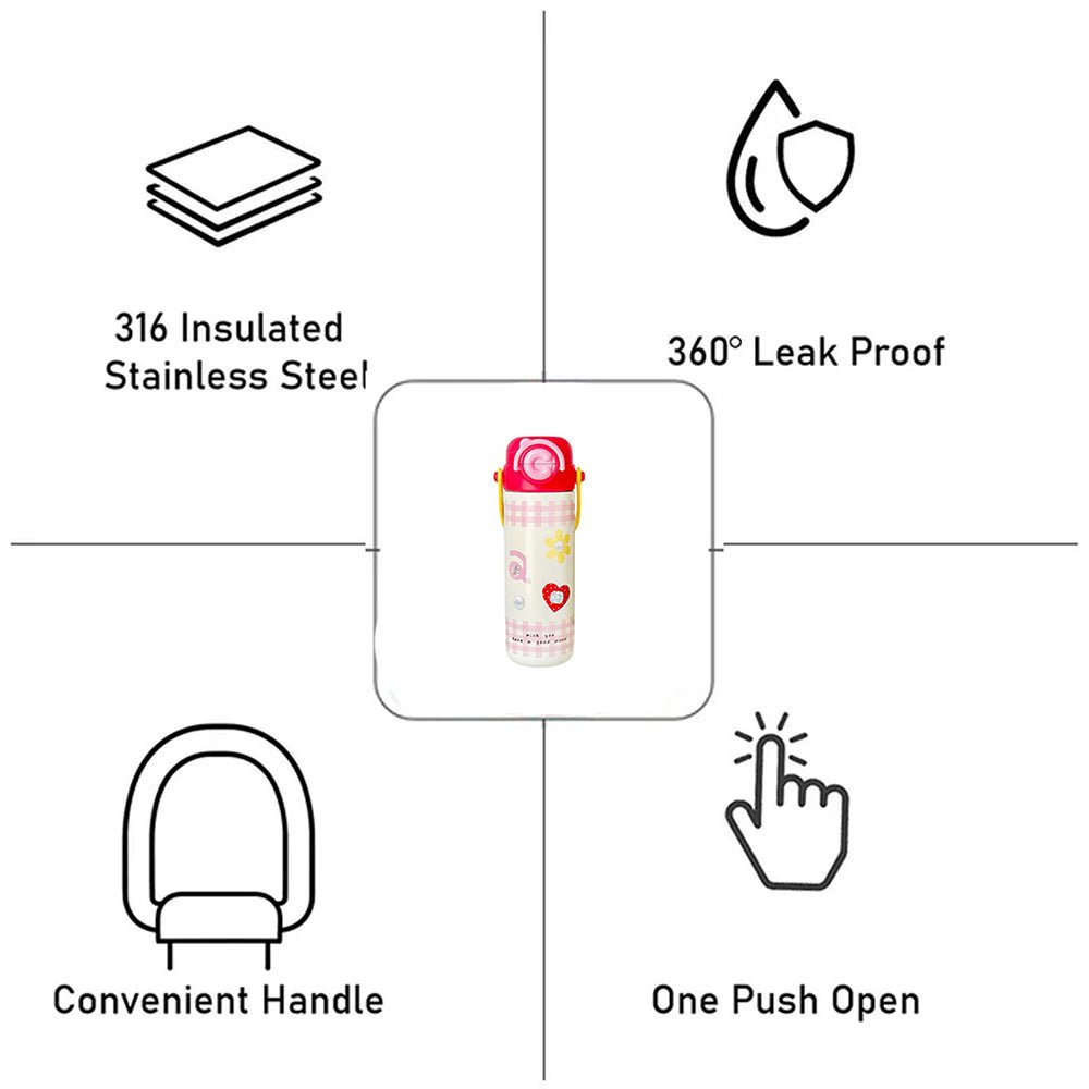 - Product Design : This bottle features a cute pastel design with pink checks, cheerful daisies, heart designs, and playful graphic elements that make it adorable and eye-catching for kids.
