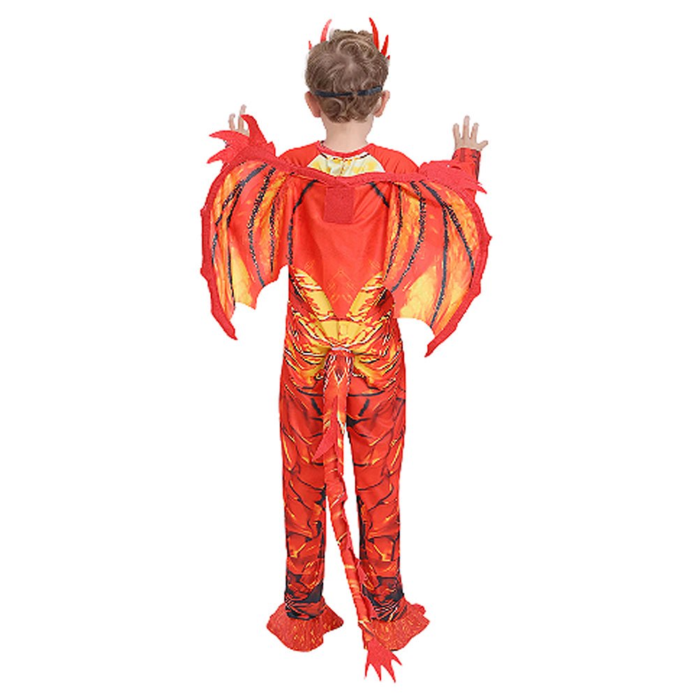 - Accessories, 5pcs Set:Ā 5 pcs set comprising of a set of Wings, A tail, a full jumpsuit style costume, a silicone headgear and a wand. This costume comes as an entire set of full length costume with silicone headgear, 3d stick on Dragon Tail , a fire wand and 3d wired dragon wings enhancing the overall look of the piece.
