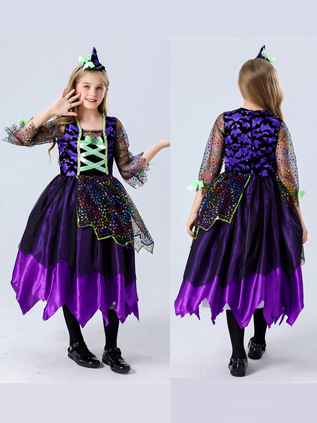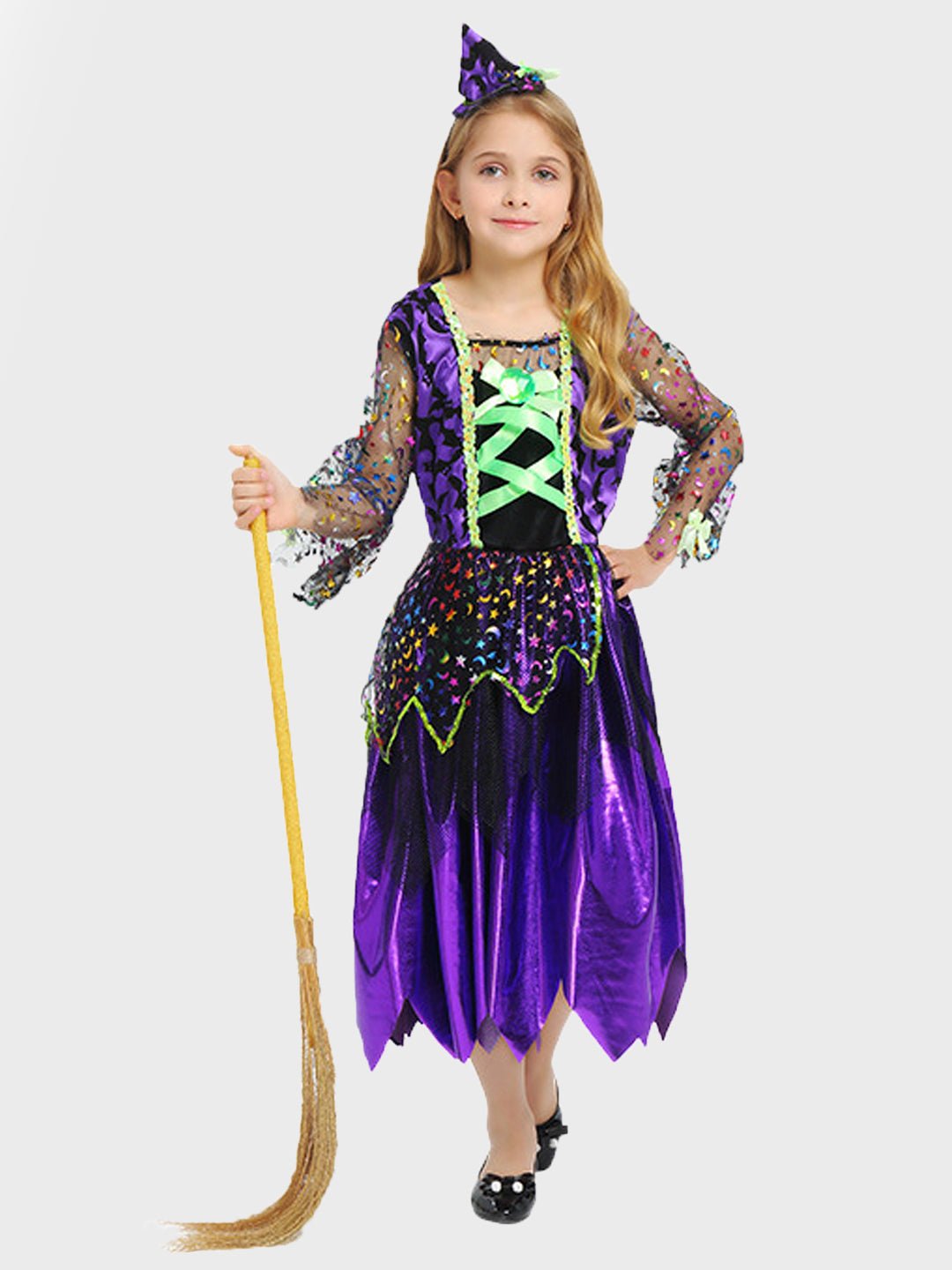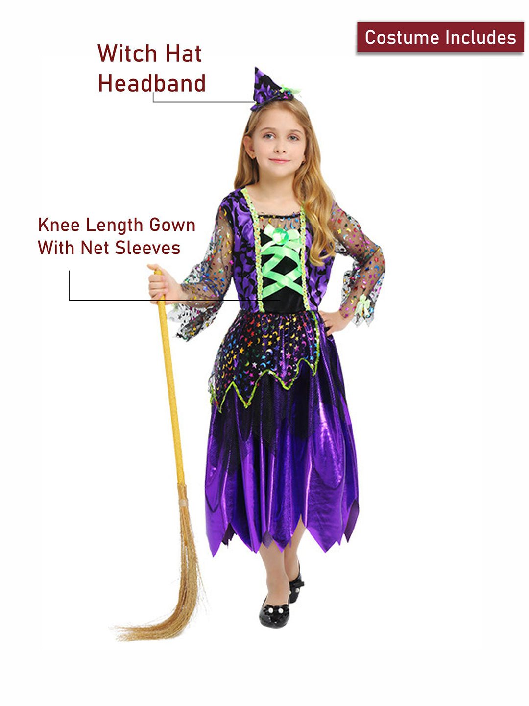 • Accessories, 2pcs set:1pc of attractive knee length shimmery frilled gown with layers and shimmer net sleeves, 1pc of cute little mini witch hat adorned headband, thereby completing the entire look of a Halloween Witch. Does not come with any hand accessory. The entire look is perfectly designed to spark imagination, turning kids into happy and cute Halloween Witches, wizards and vampires.