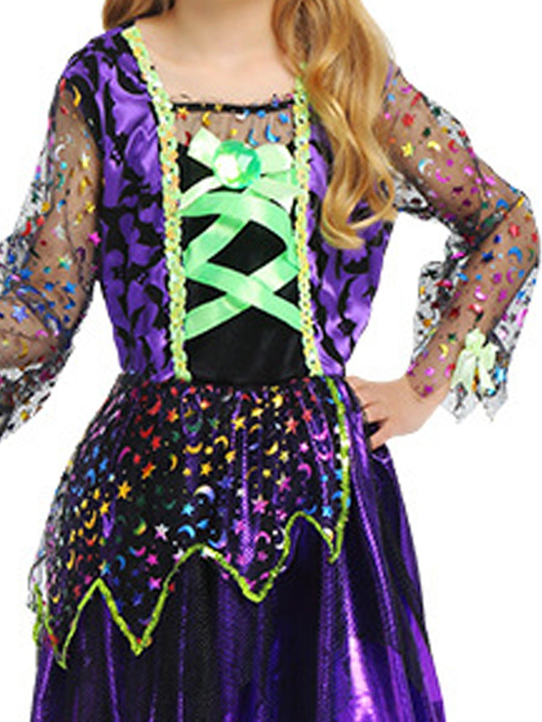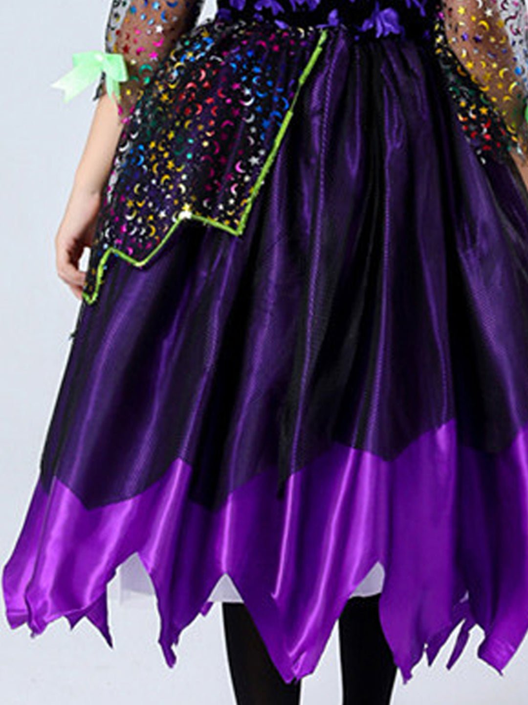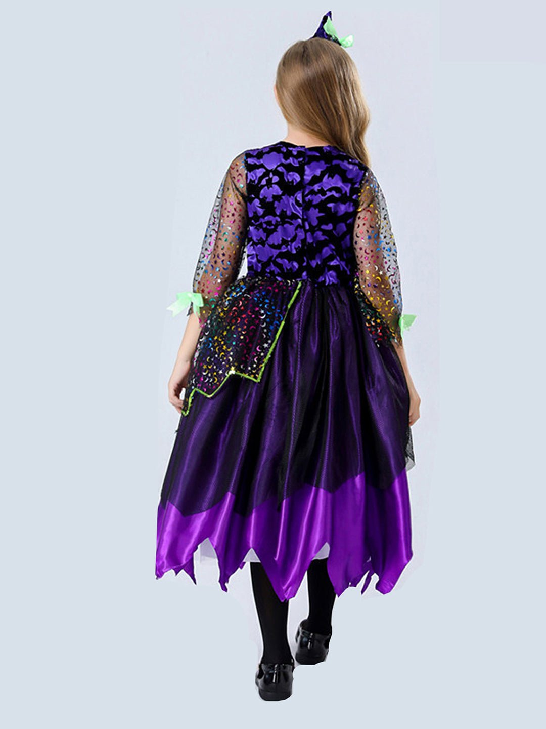 • Accessories, 2pcs set:1pc of attractive knee length shimmery frilled gown with layers and shimmer net sleeves, 1pc of cute little mini witch hat adorned headband, thereby completing the entire look of a Halloween Witch. Does not come with any hand accessory. The entire look is perfectly designed to spark imagination, turning kids into happy and cute Halloween Witches, wizards and vampires.
