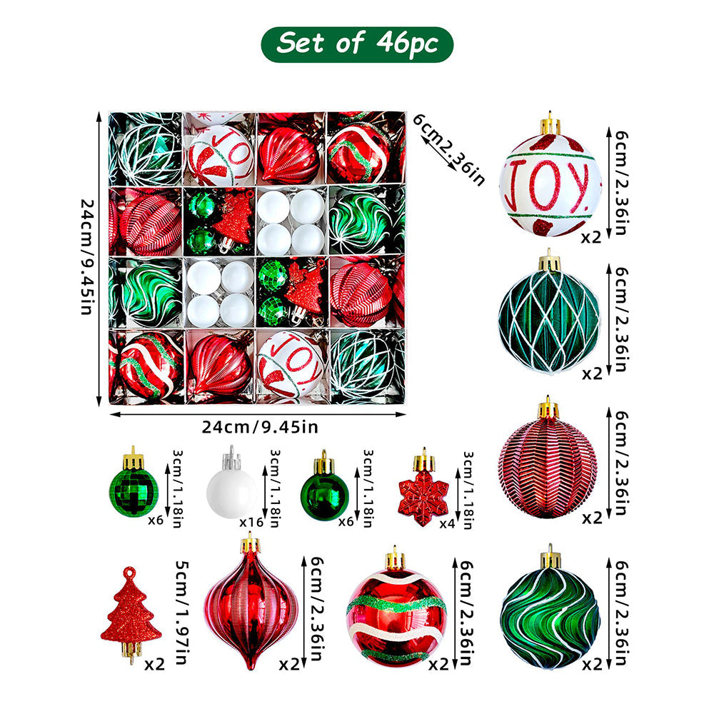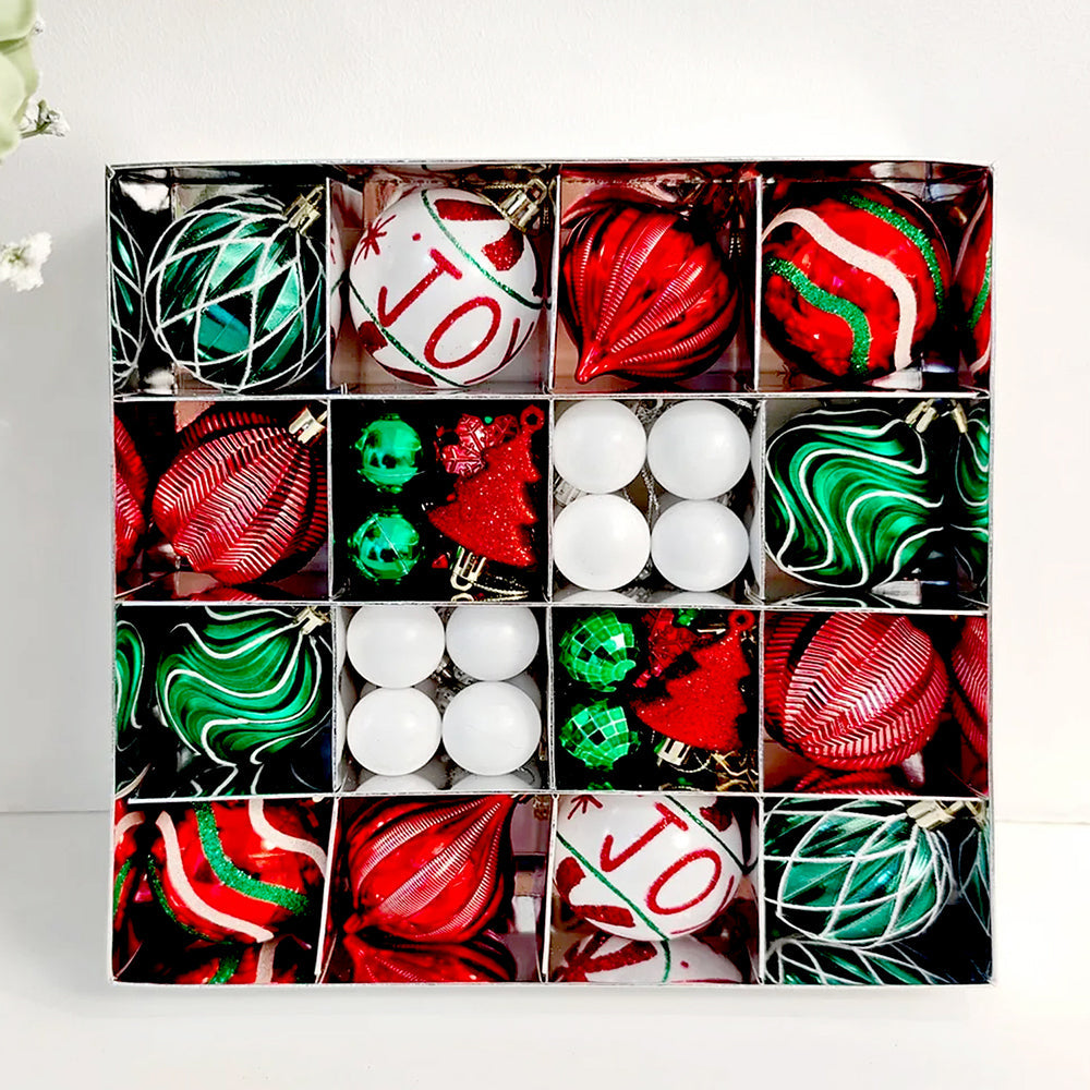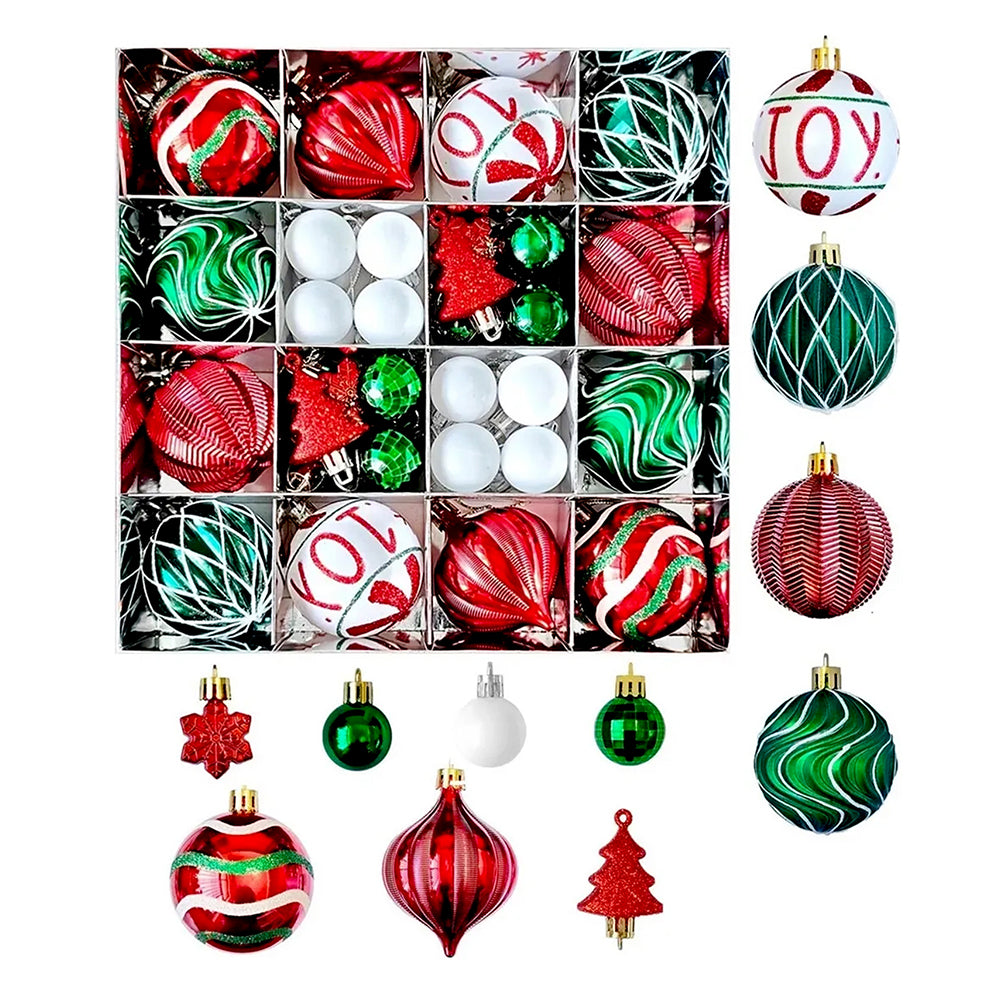 - 46 pcs Christmas Decoration Balls Set: A unique, premium Joy Swirls Red, Green & White themed Christmas decoration balls set designed in vibrant festive tones, offering a beautiful mix of exclusive designs, shapes, and textures to elevate your Christmas décor.