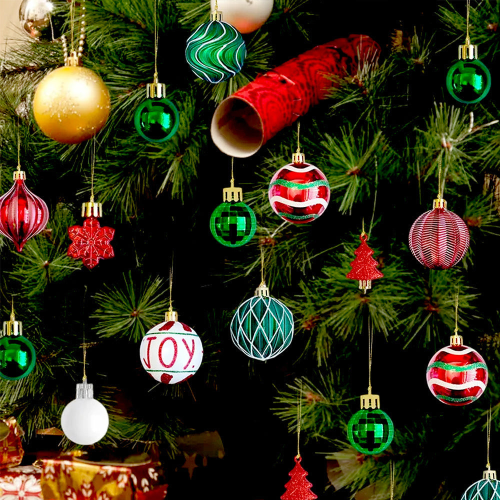 - Joy Swirls Themed Xmas Balls: This set includes 46 beautifully crafted ornaments inspired by joyful Christmas patterns and colours. The collection features JOY-printed baubles, striped ornaments, glossy green and white baubles, swirl-textured drops, star pieces, tree-shaped ornaments and more. Each ornament is thoughtfully detailed, giving your Christmas tree a fun, lively, and irresistibly festive appeal.