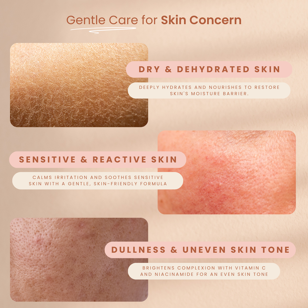 With skin-loving actives like Hyaluronic Acid, Vitamin C, Ceramides, and Niacinamide, it delivers long-lasting hydration, smoothes texture, and visibly reduces dullness and uneven tone supporting your skin as it changes.